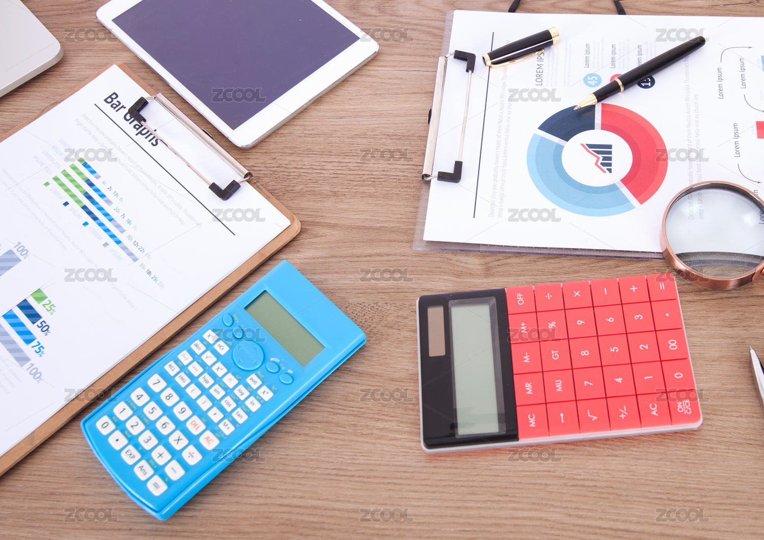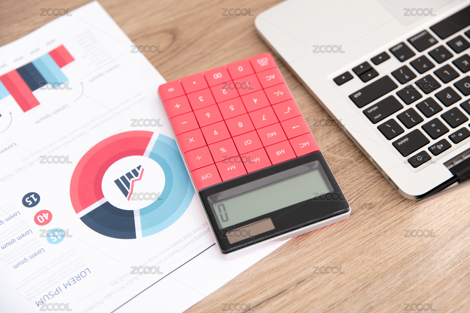 笔记本电脑前的资料夹和计算器及一杯咖啡