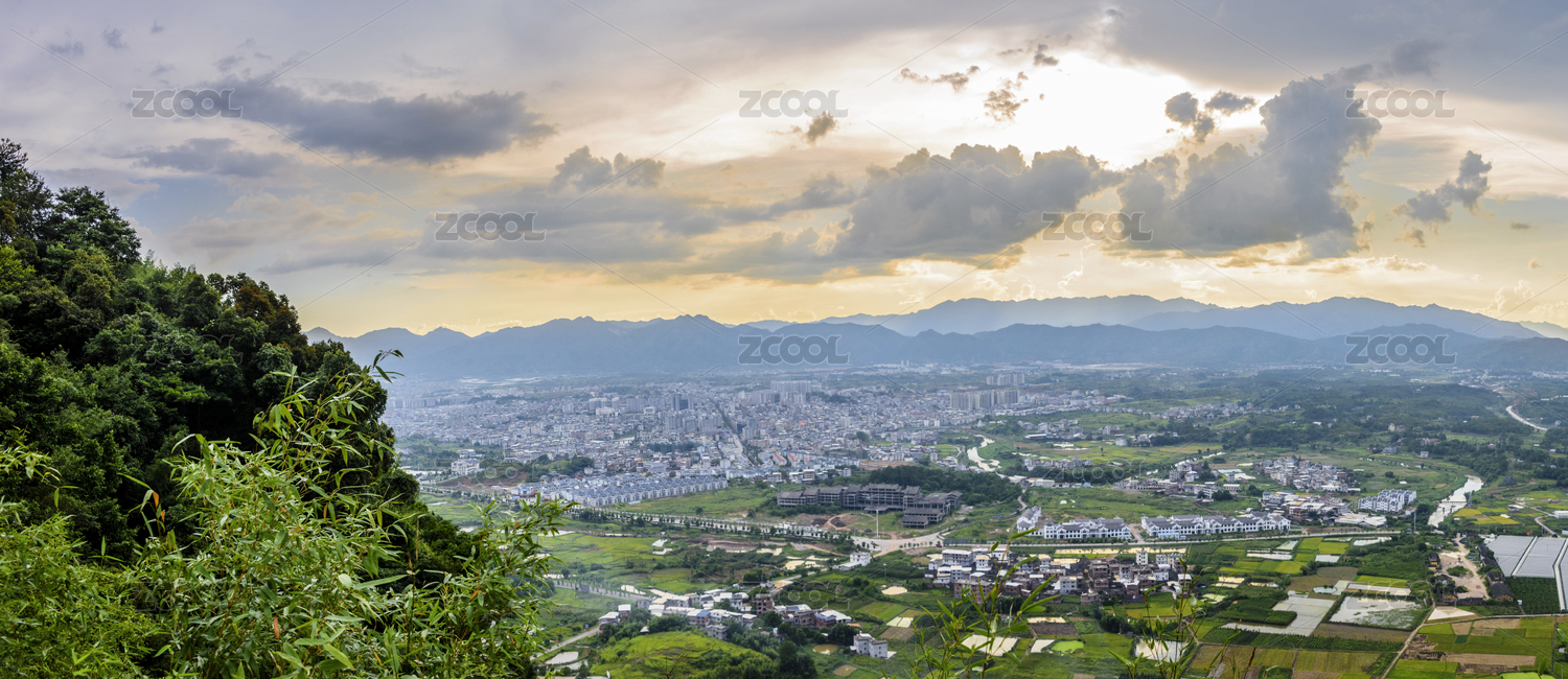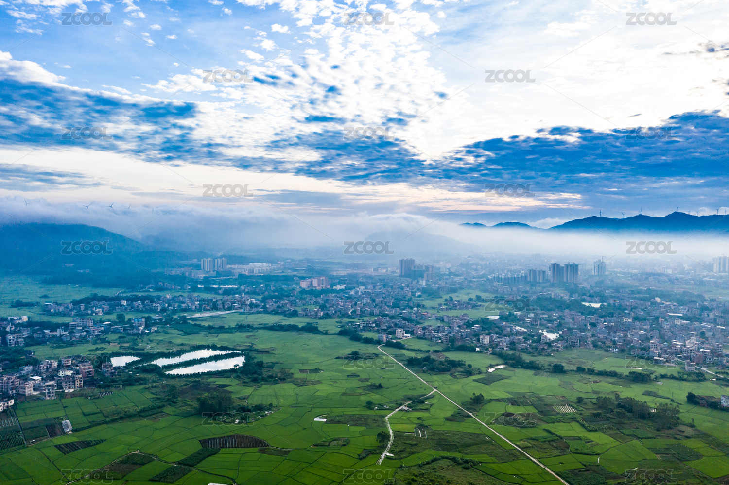 陕西汉中南郑米仓山下的田园落日风光航拍图