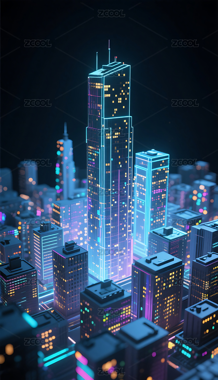 梦幻荧光色城市建筑赛博3D卡通立体插画