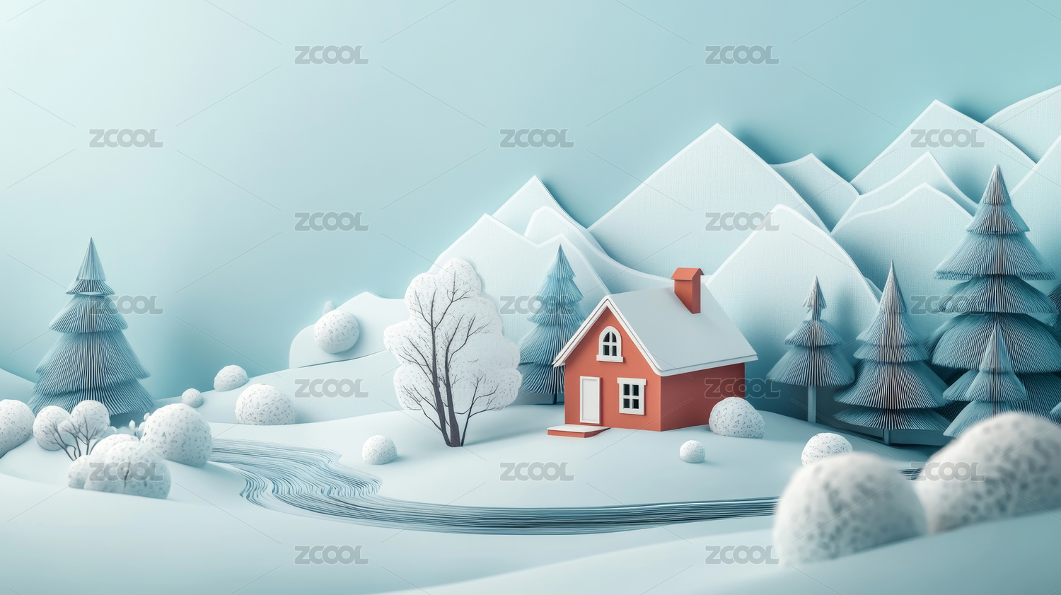 三维,立体,3D,插画,背景,壁纸,雪景,小屋,雪山,自然