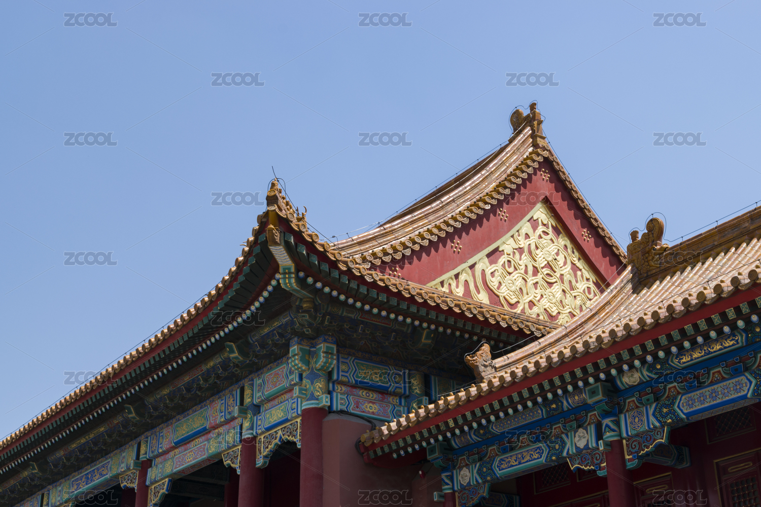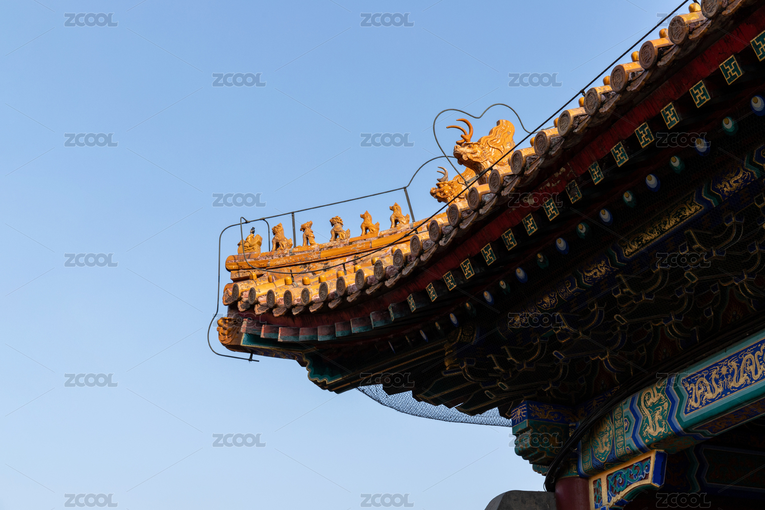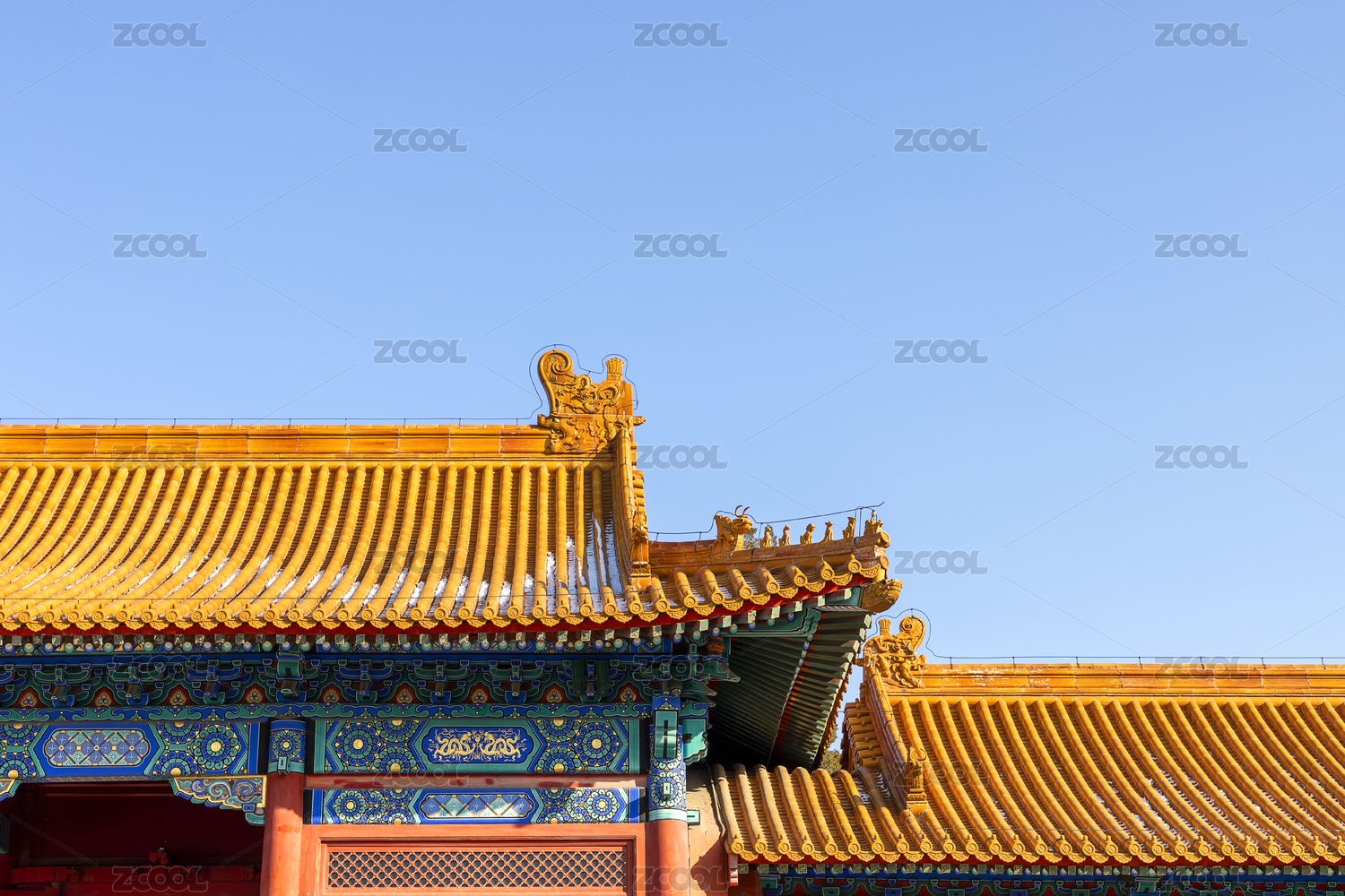 中国北京故宫博物院古建正面一角——琉璃瓦屋顶、瑞兽
