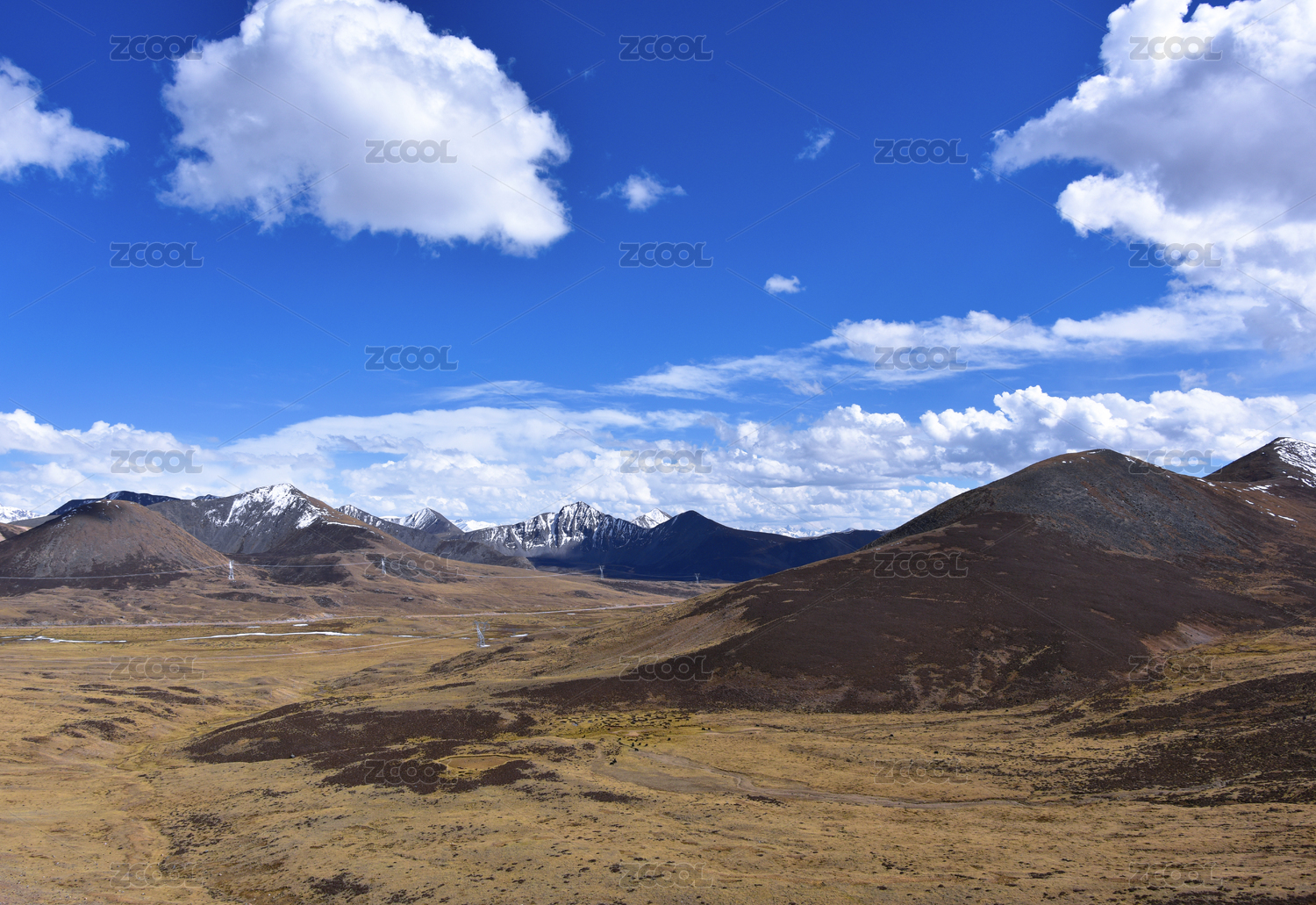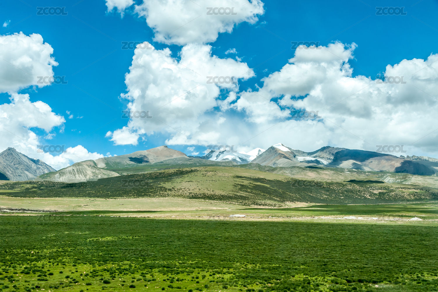 蓝天白云下的草原山脉和高原牧场,中国西藏