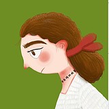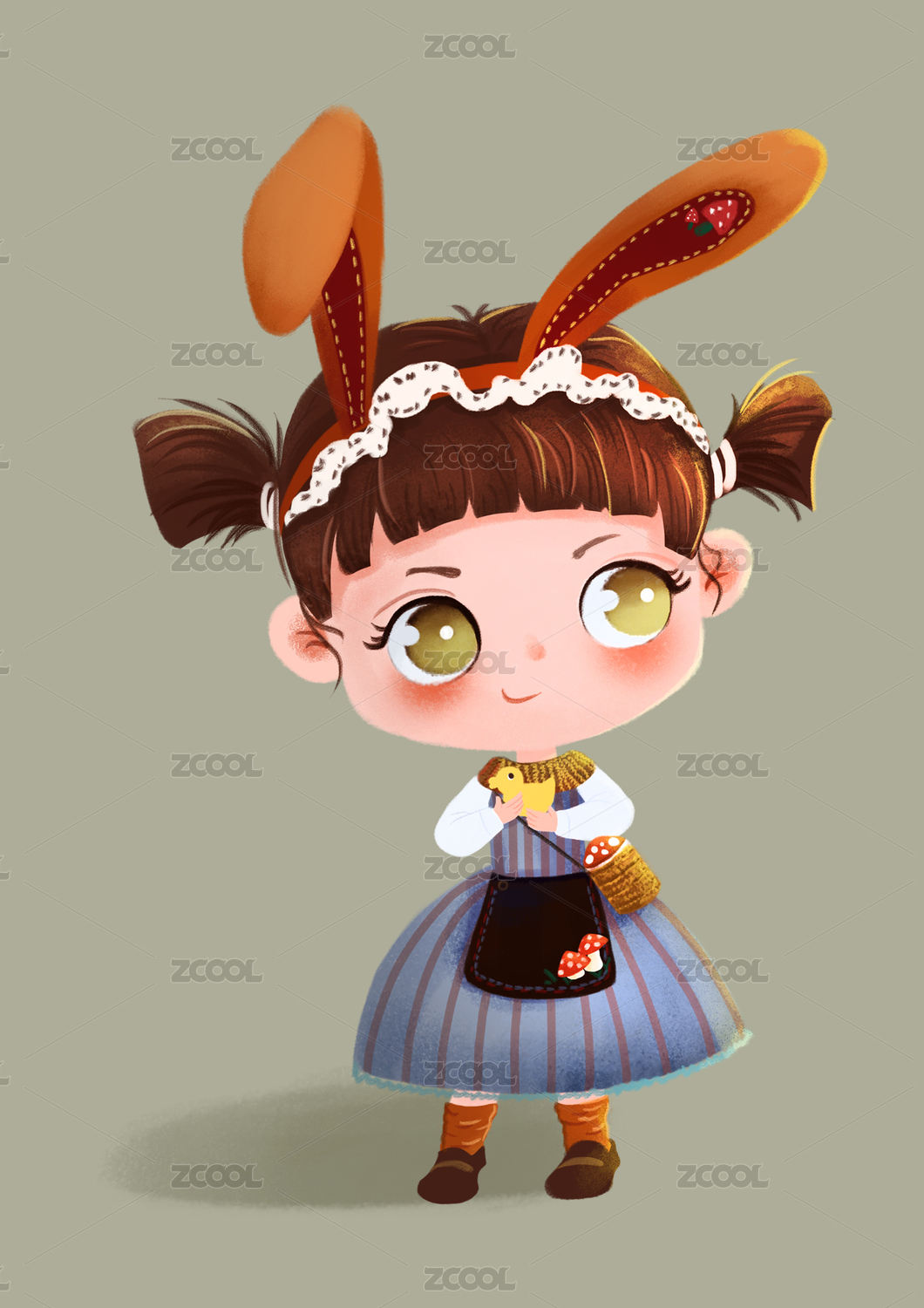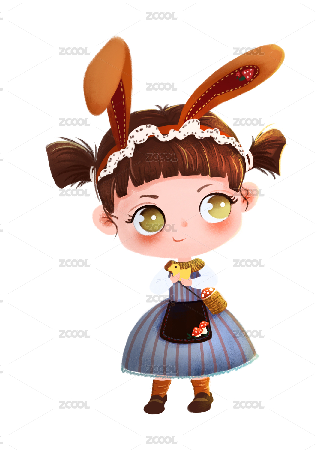 拉着熊玩具的戴兔耳朵发带的小女孩衣袖太长