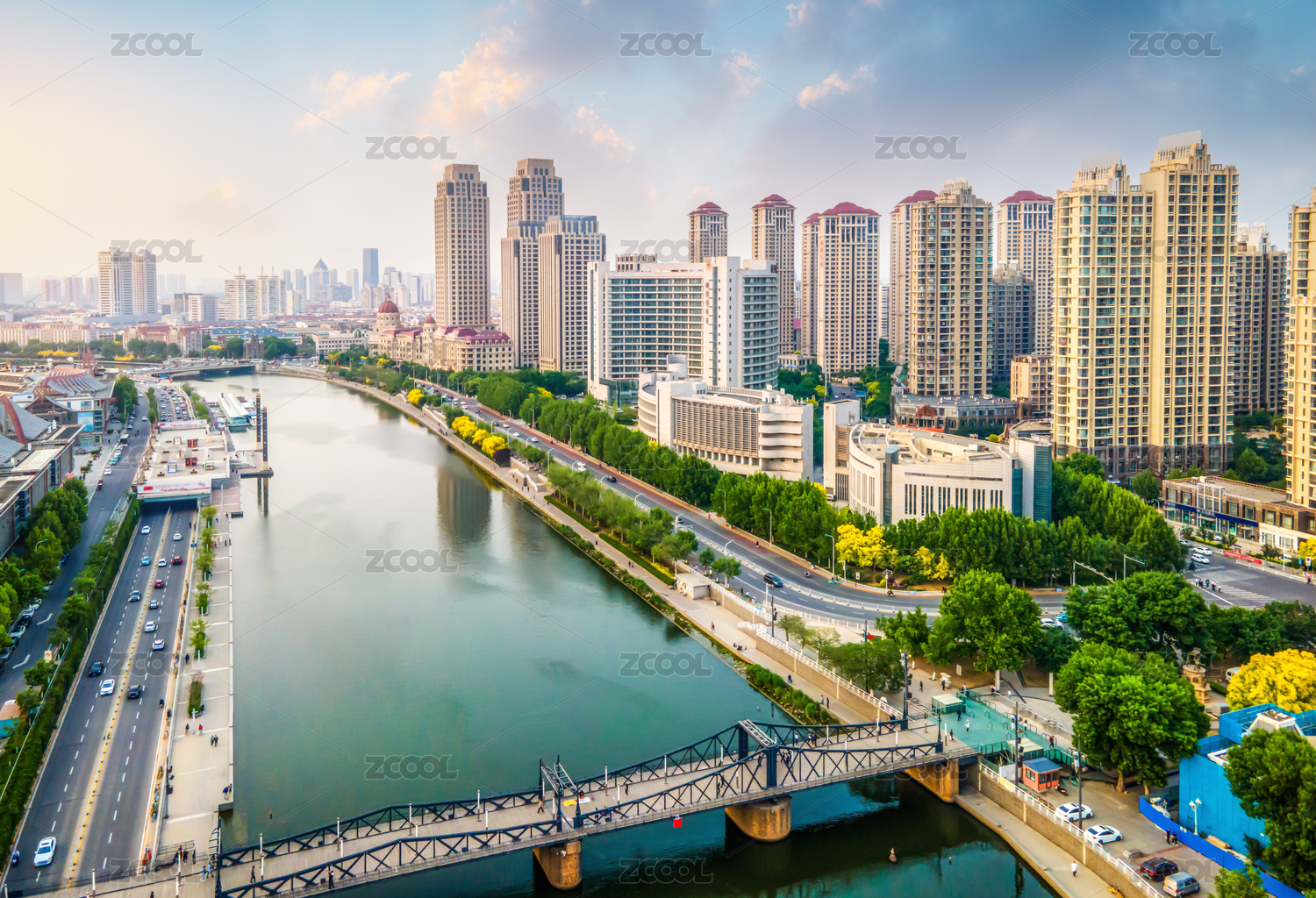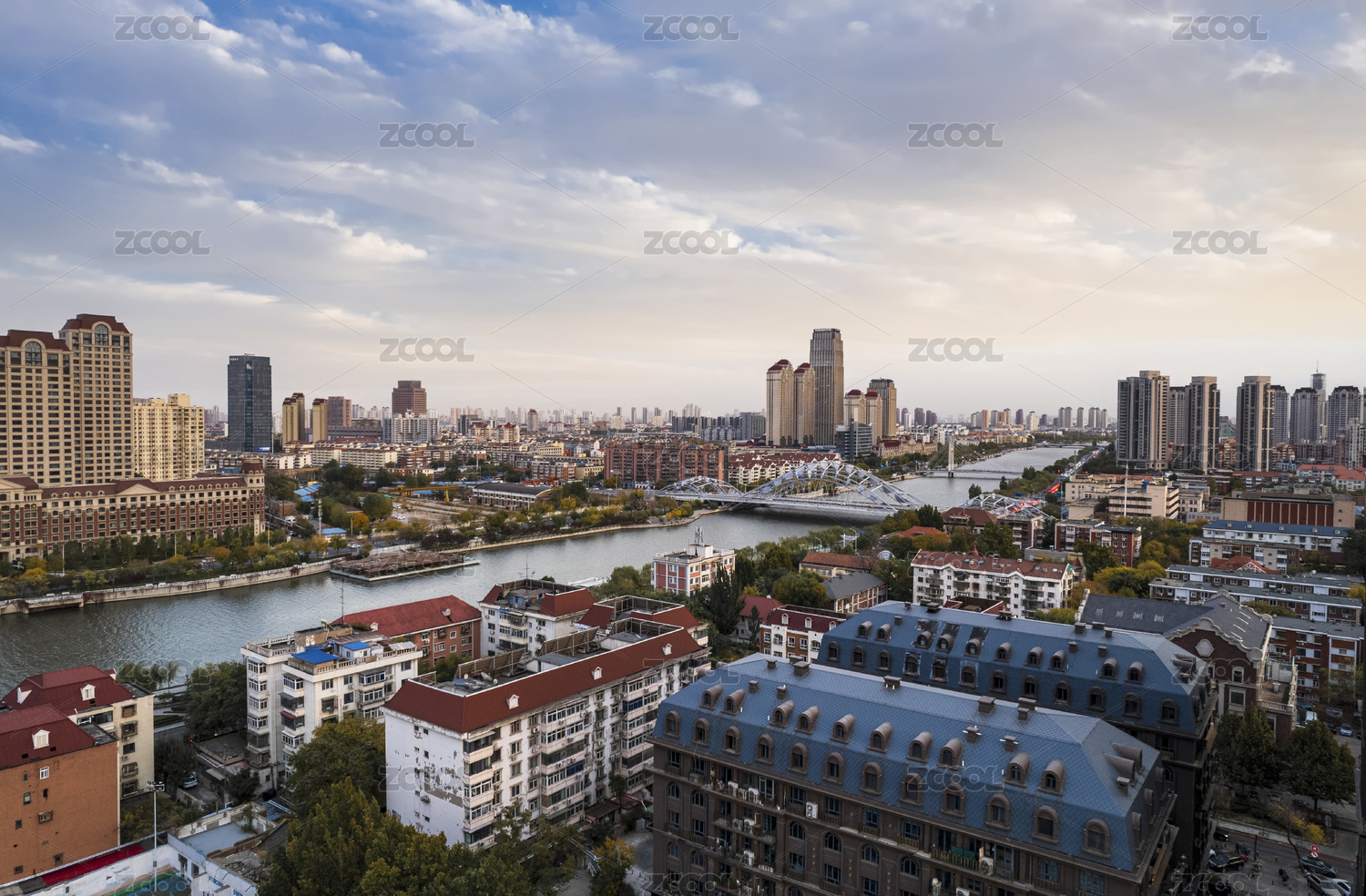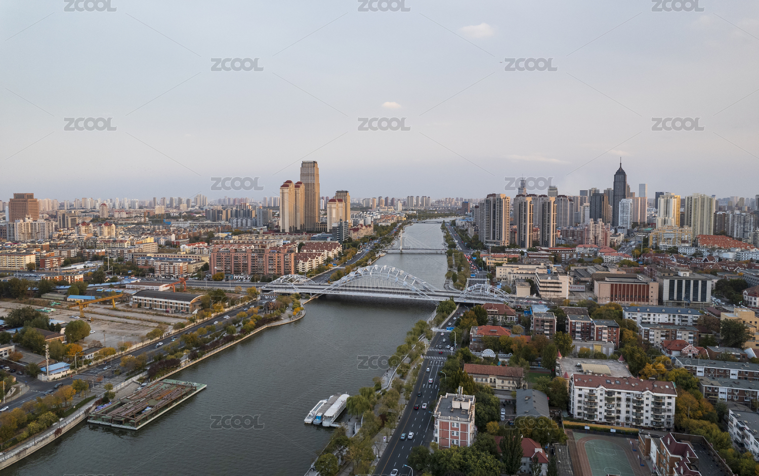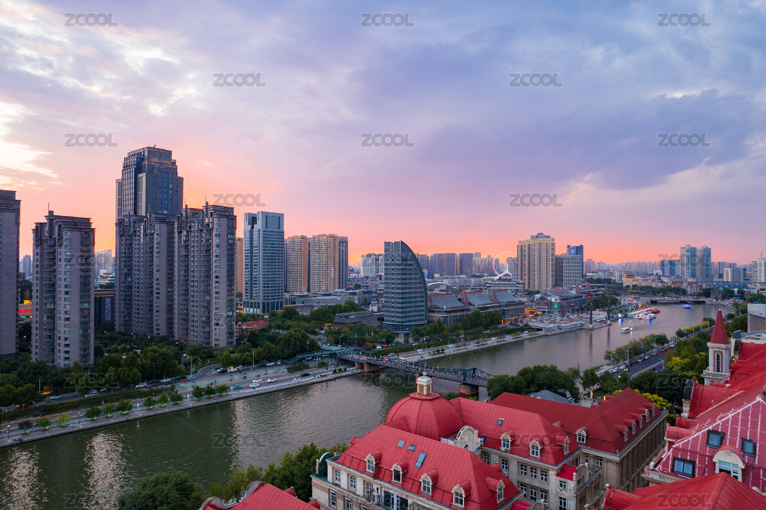 天津海河直沽桥沿岸小白楼商圈城市日落风光