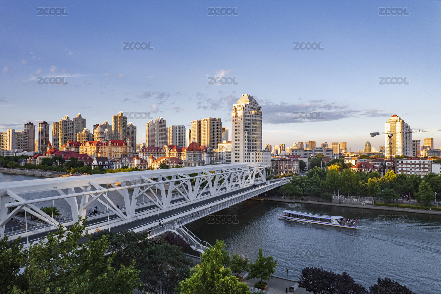 天津海河金阜桥沿岸小白楼商圈城市日落风光