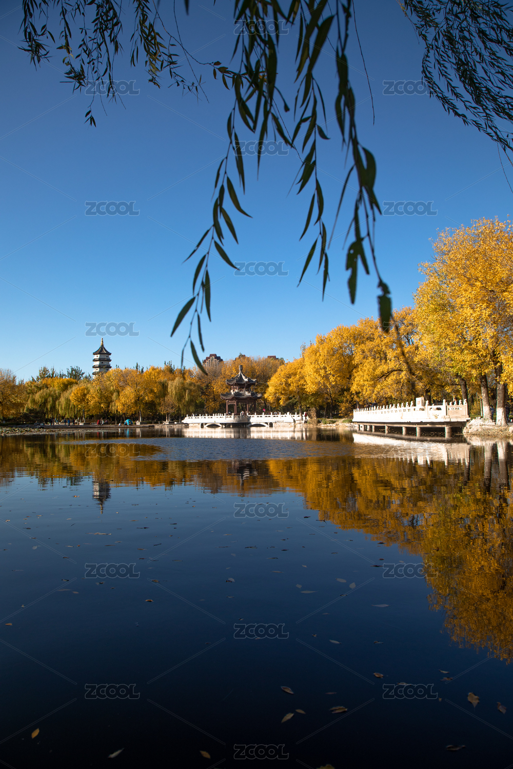 金黄色垂柳环绕的北京陶然亭公园湖心亭
