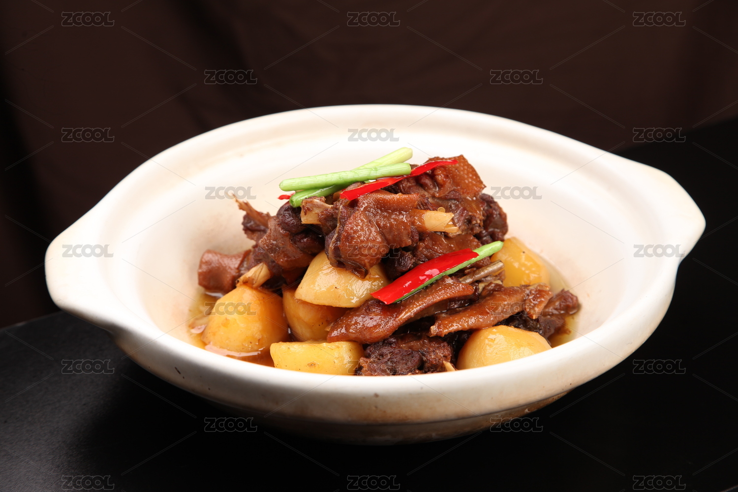 白色大盆里的红烧土豆烧鸡