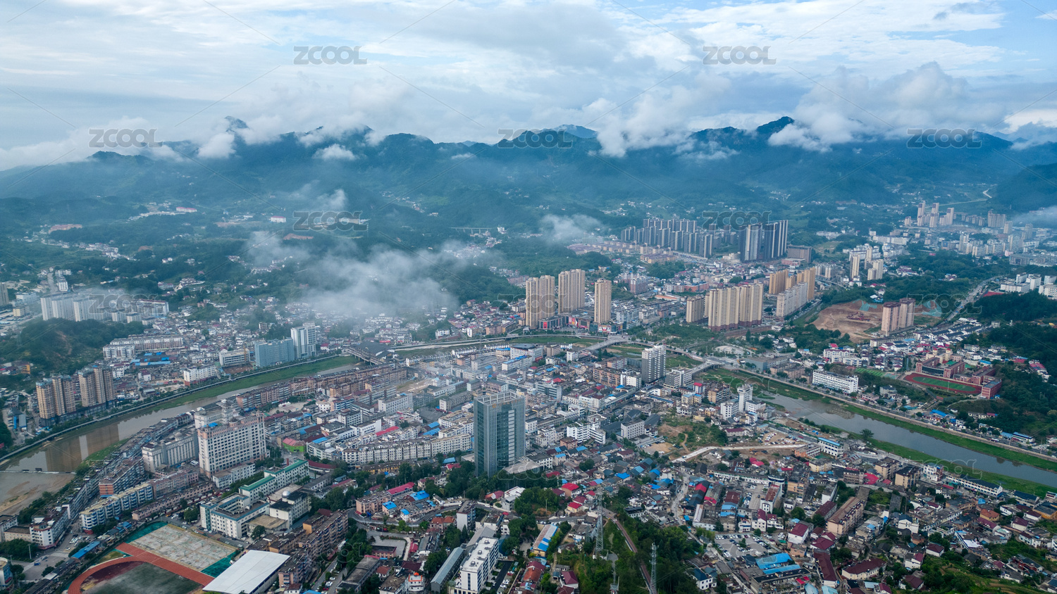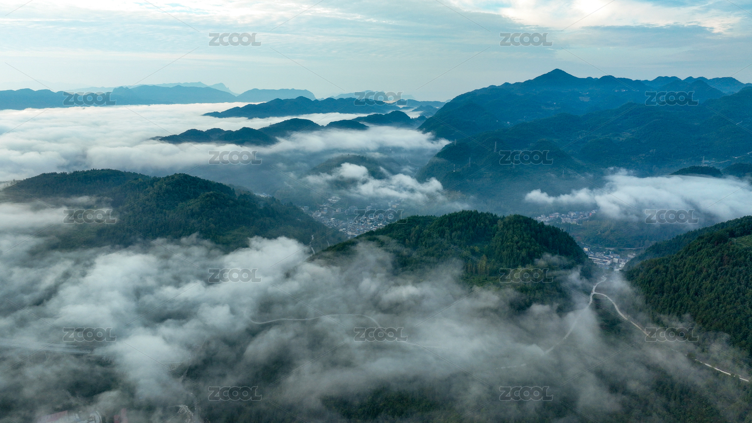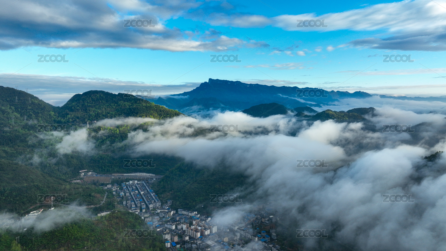 中国湖南溆浦县城溆水河高空云海航拍图