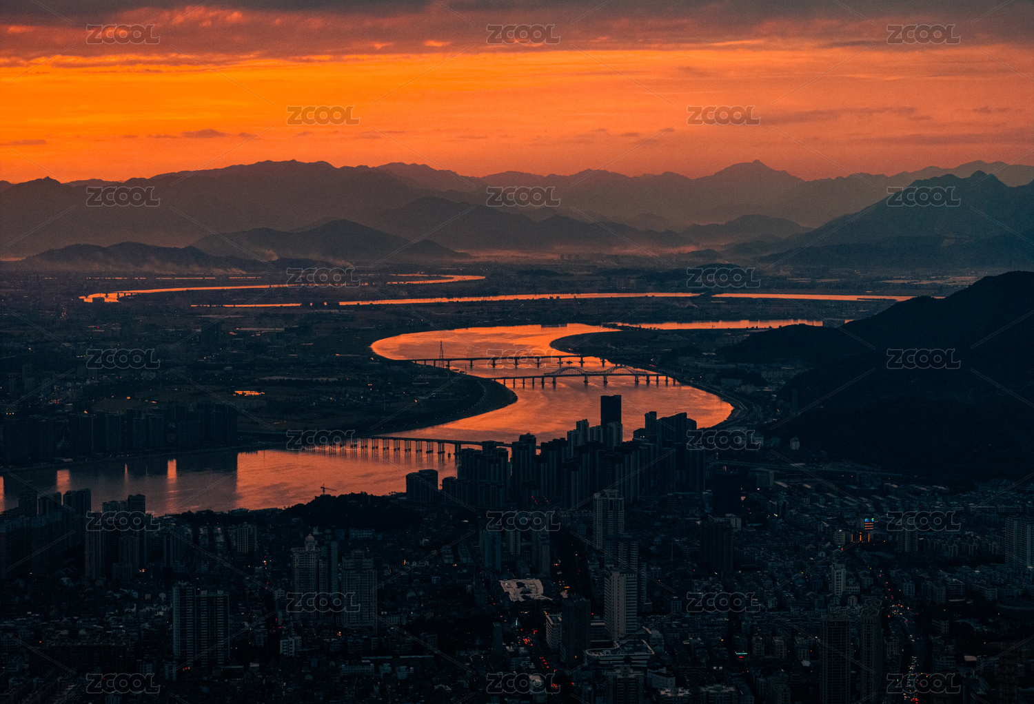 航拍火烧云下的福建福州市区闽江和岛屿