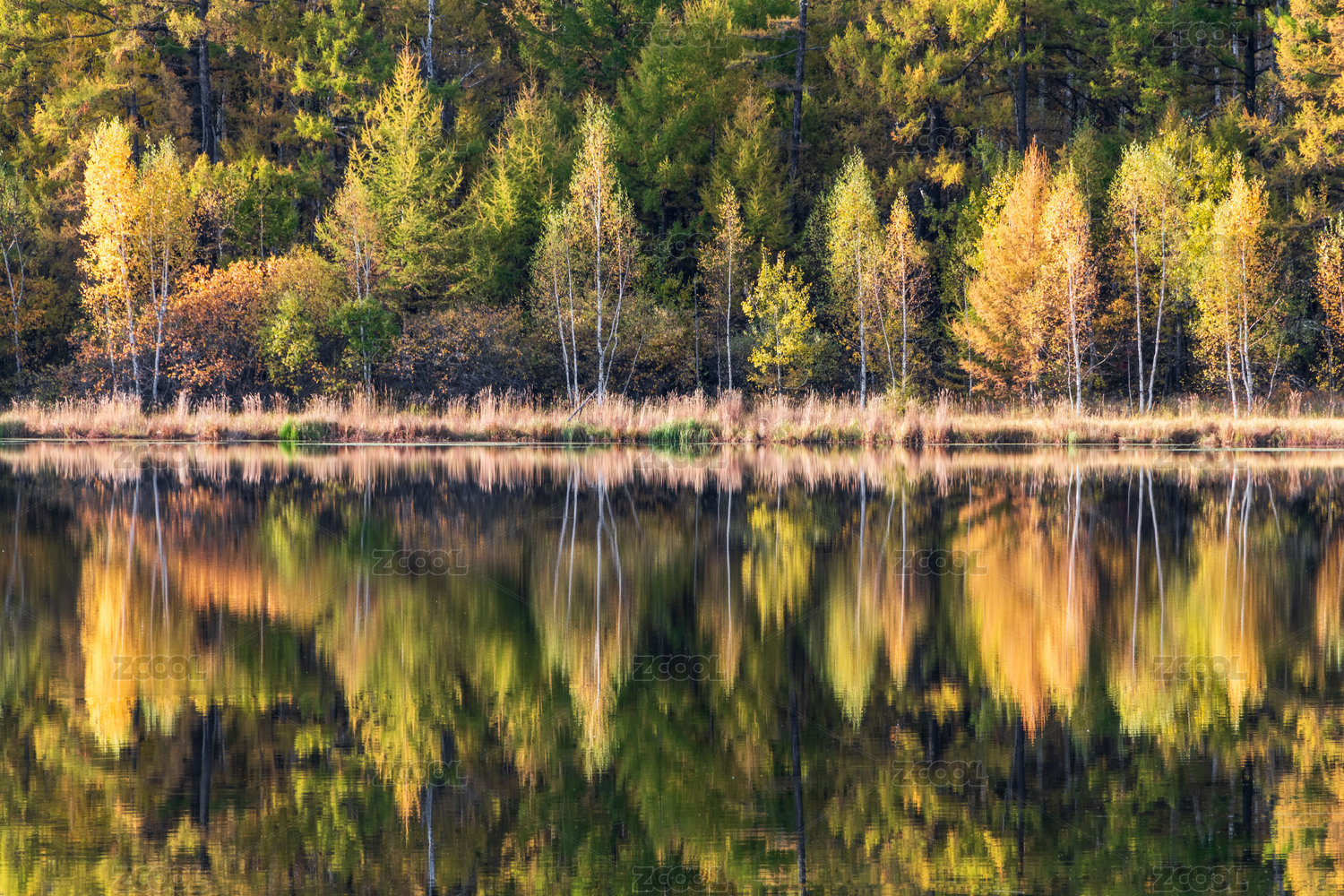 中国大兴安岭金秋荒野河畔多姿多彩自由生长的植物