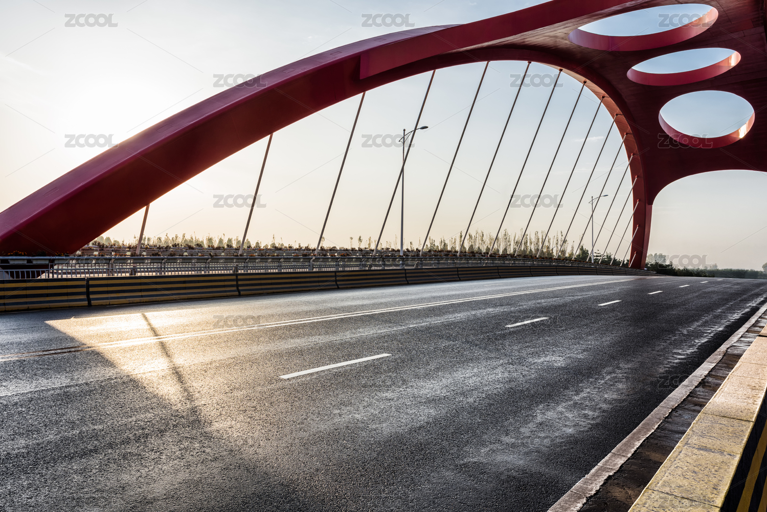 中国武汉空旷的桥梁的柏油路面与现代城市建筑天际线全景