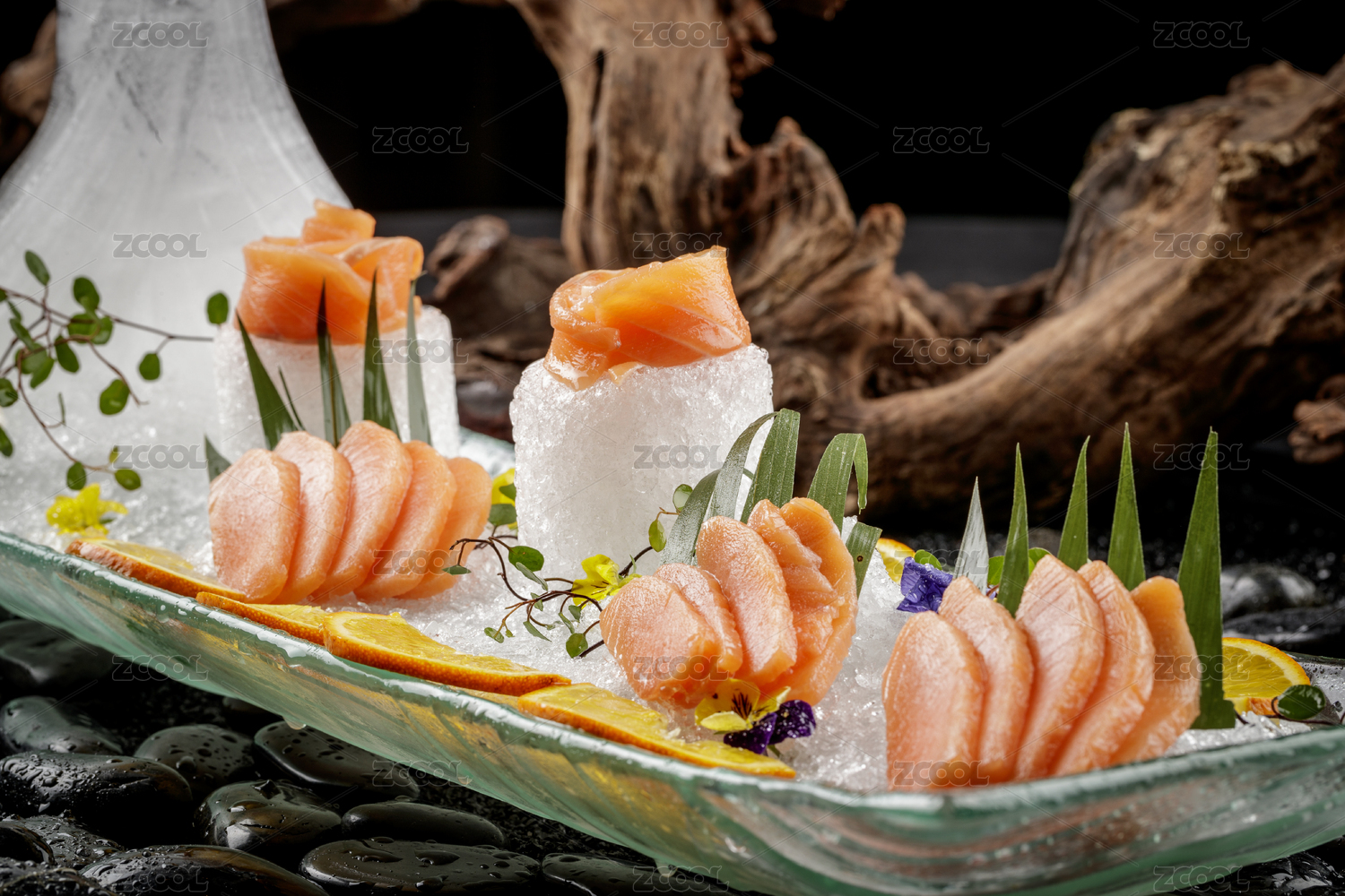极品三文鱼刺身摆放在黑色鹅卵石上