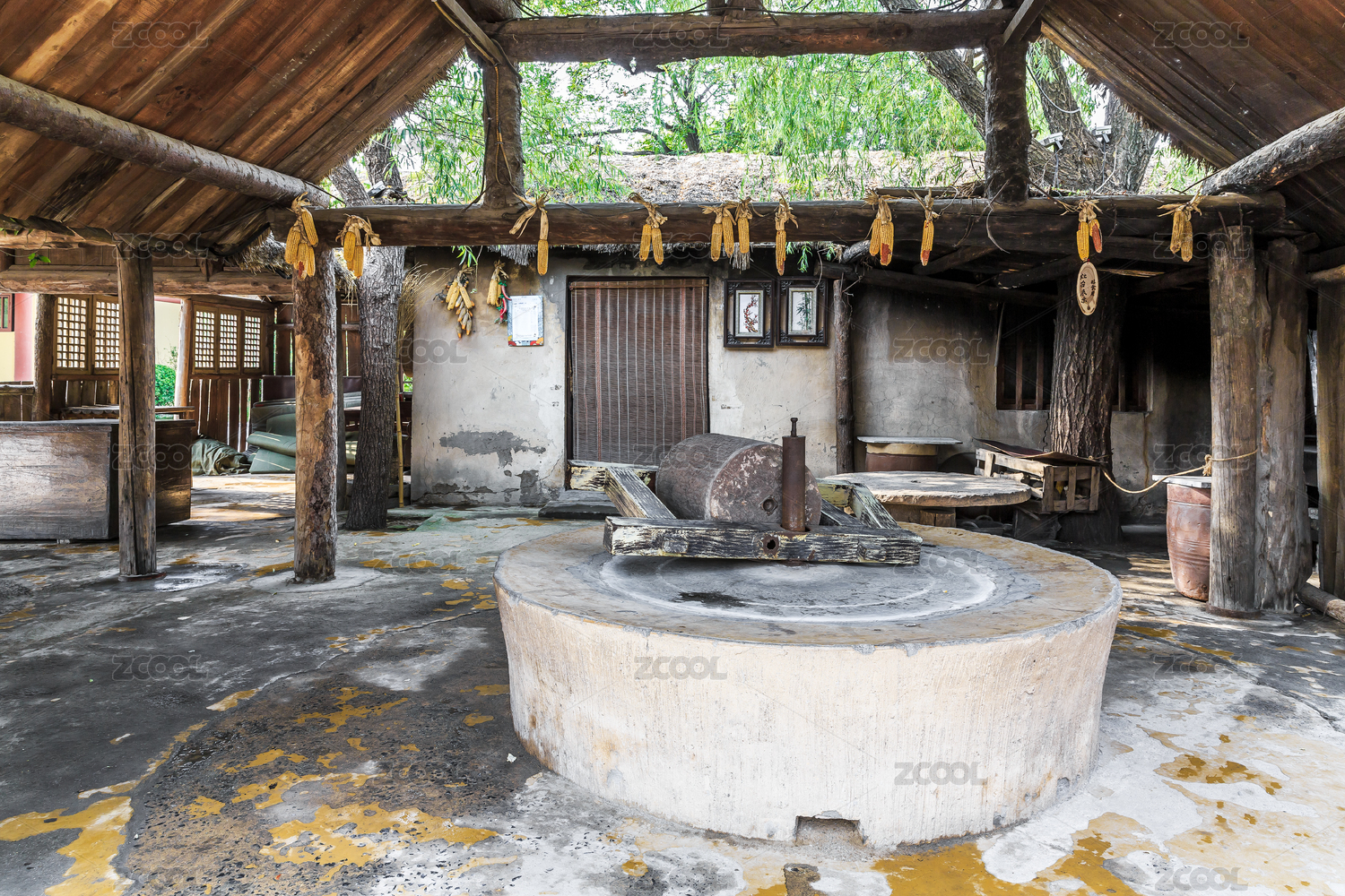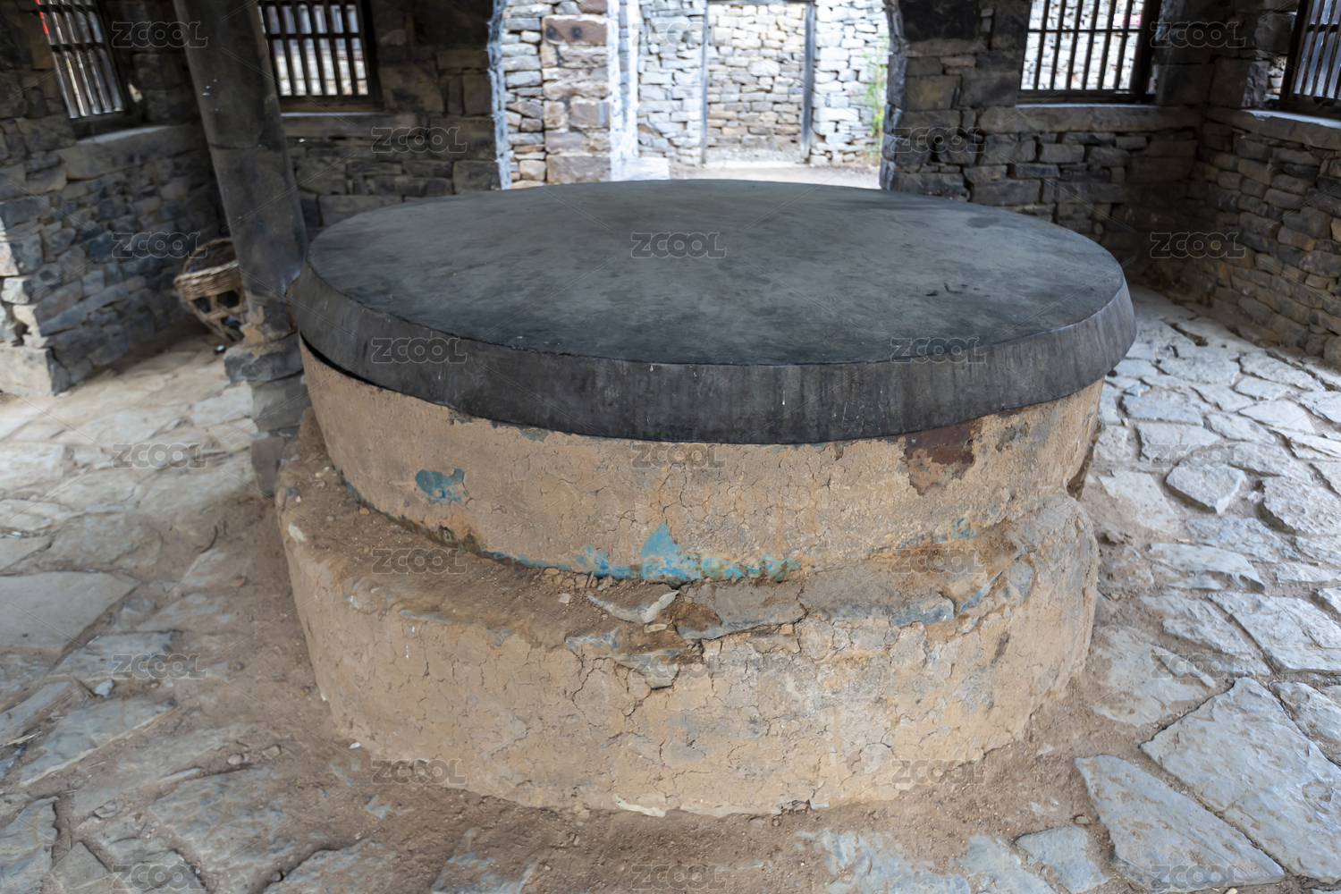 中国山东省临沂市沂蒙红色影视基地内沂蒙山村的石碾子