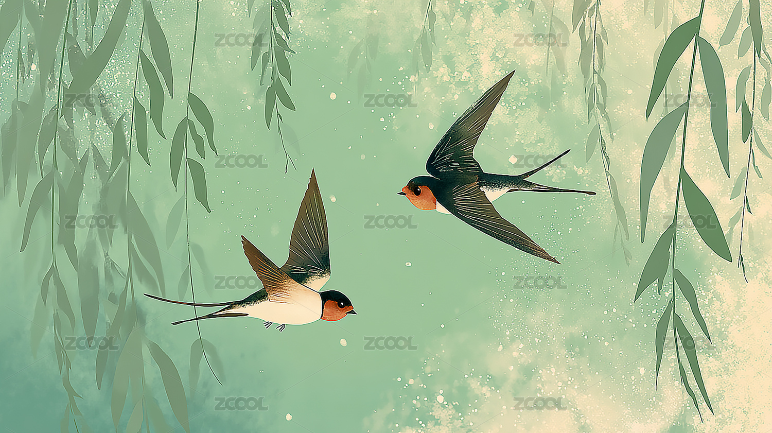 绿色柳树燕子飞翔插画