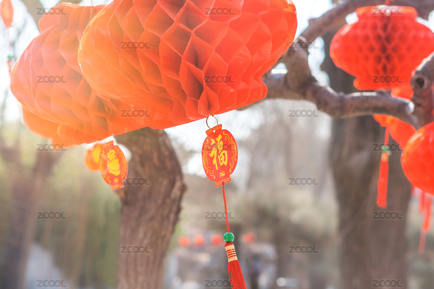 中国农历新年,中国红灯笼挂在树枝上的细节。