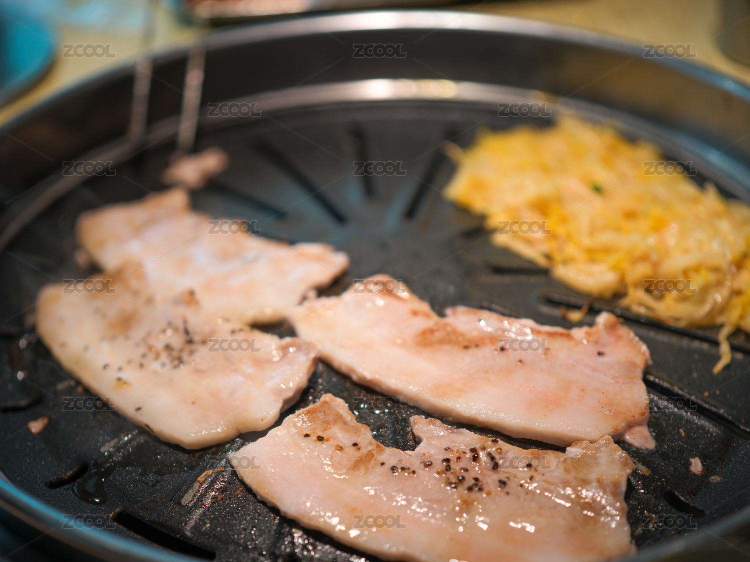 日式烧肉铁板上的美味葱盐烤牛舌特写