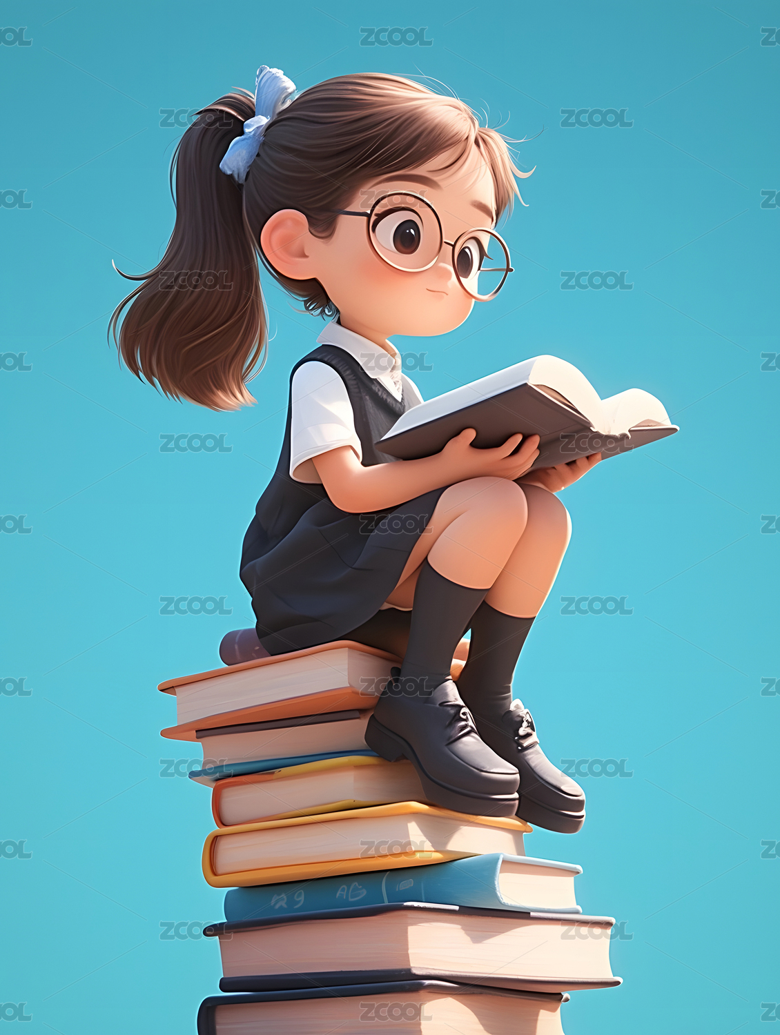 3D卡通风格坐在书堆上阅读读书的女孩肖像