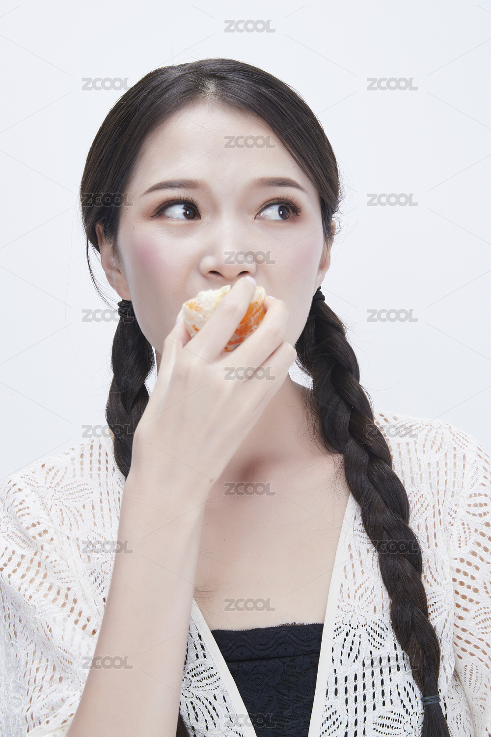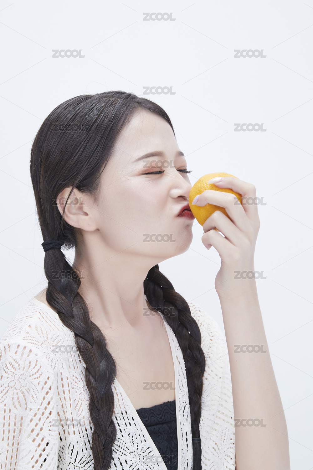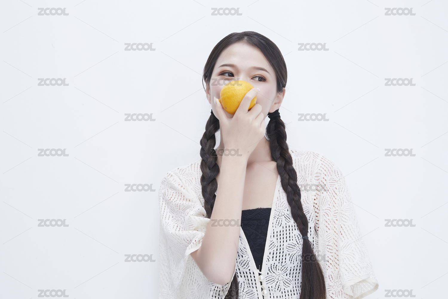 啃咬橙子身穿镂空连衣裙的亚洲可爱少女人像