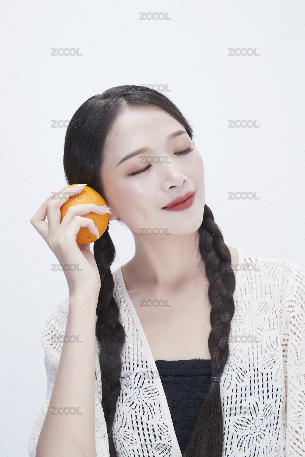 手拿橙子身穿镂空连衣裙的亚洲可爱少女人像