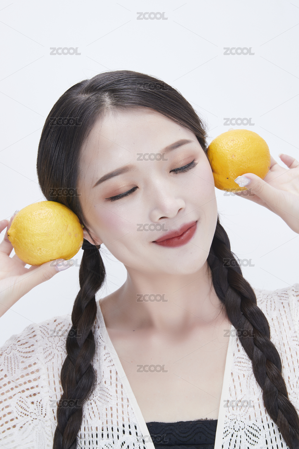 头顶柠檬身穿镂空连衣裙的亚洲可爱少女人像
