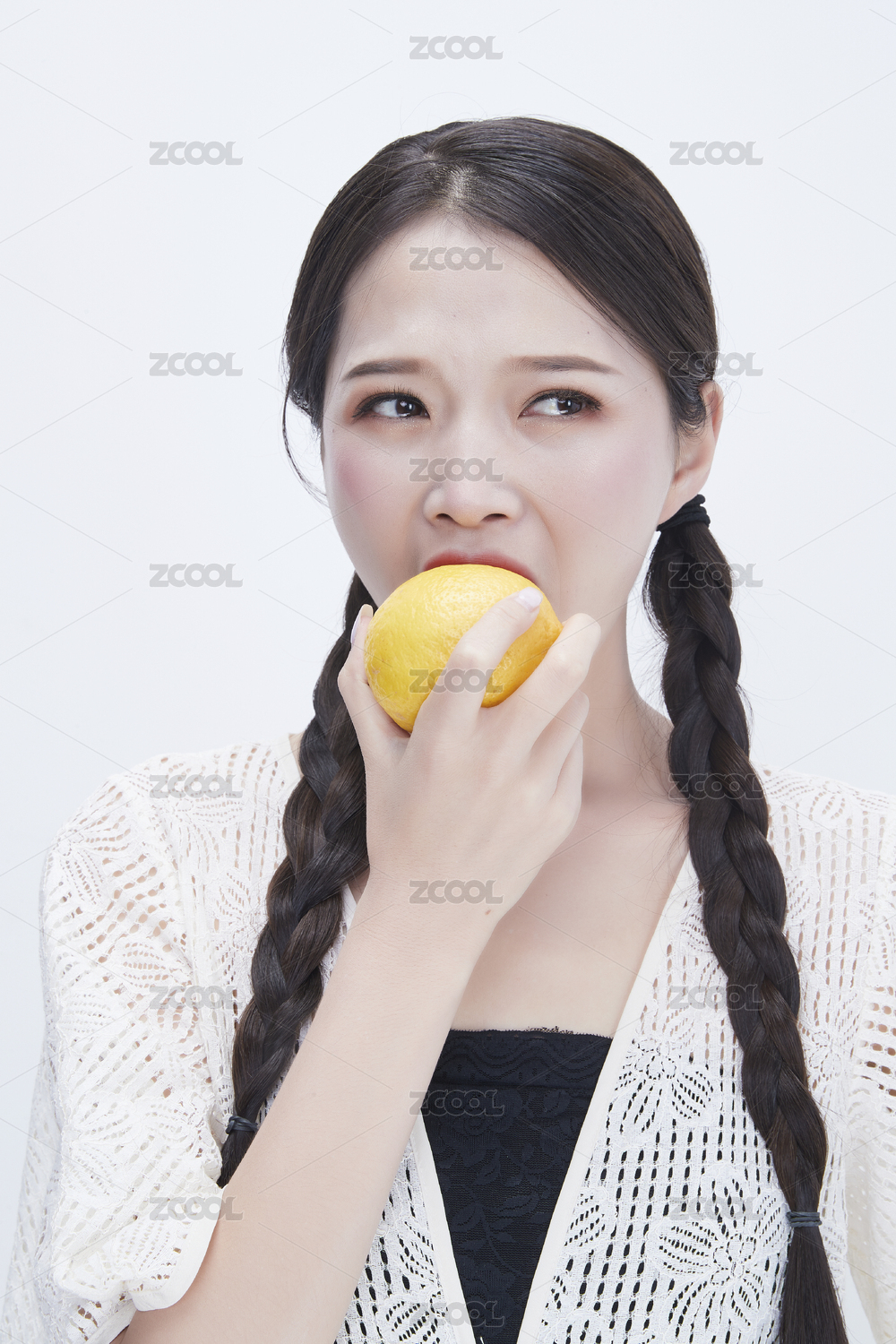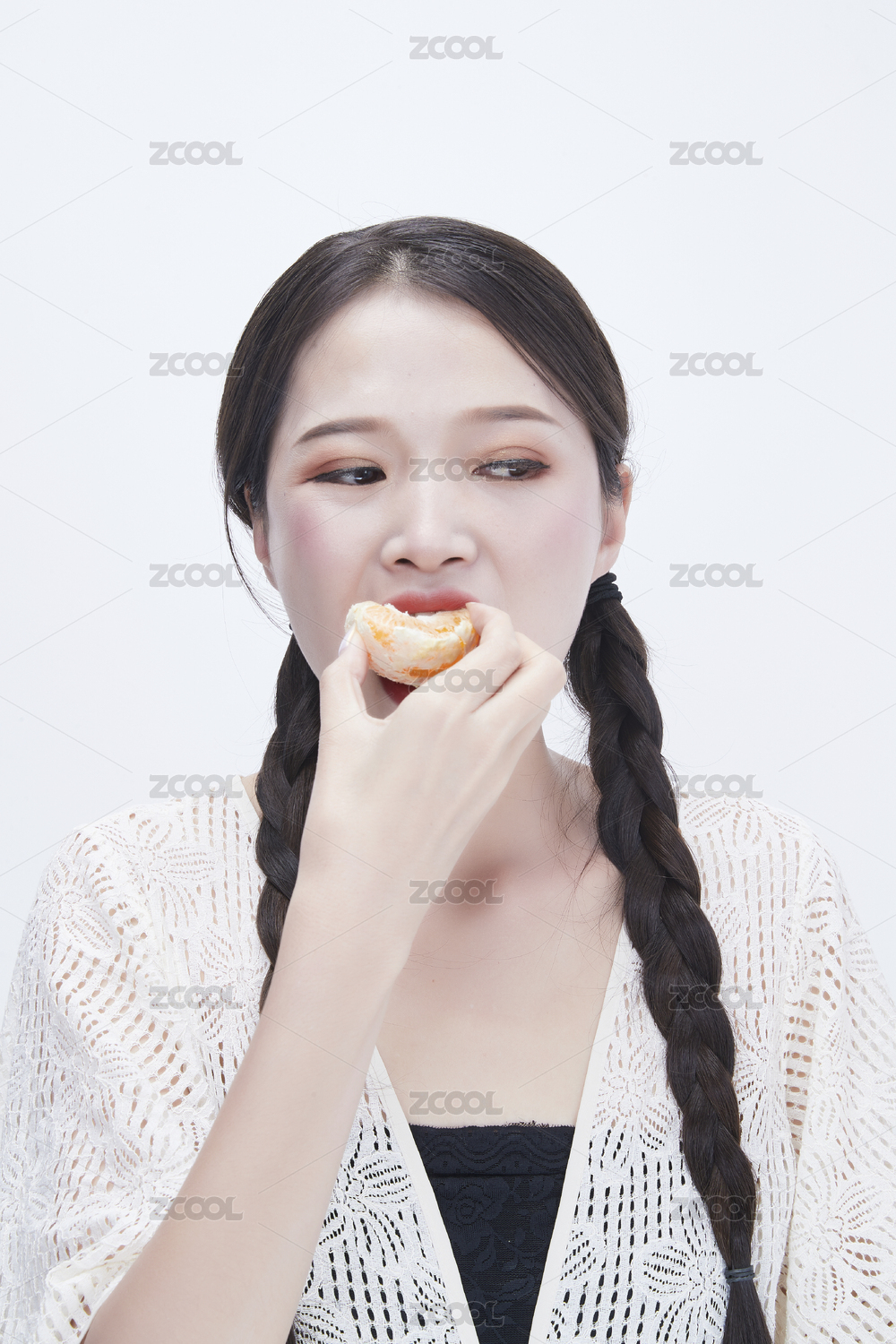 吃橙子被酸到的身穿镂空连衣裙可爱少女人像