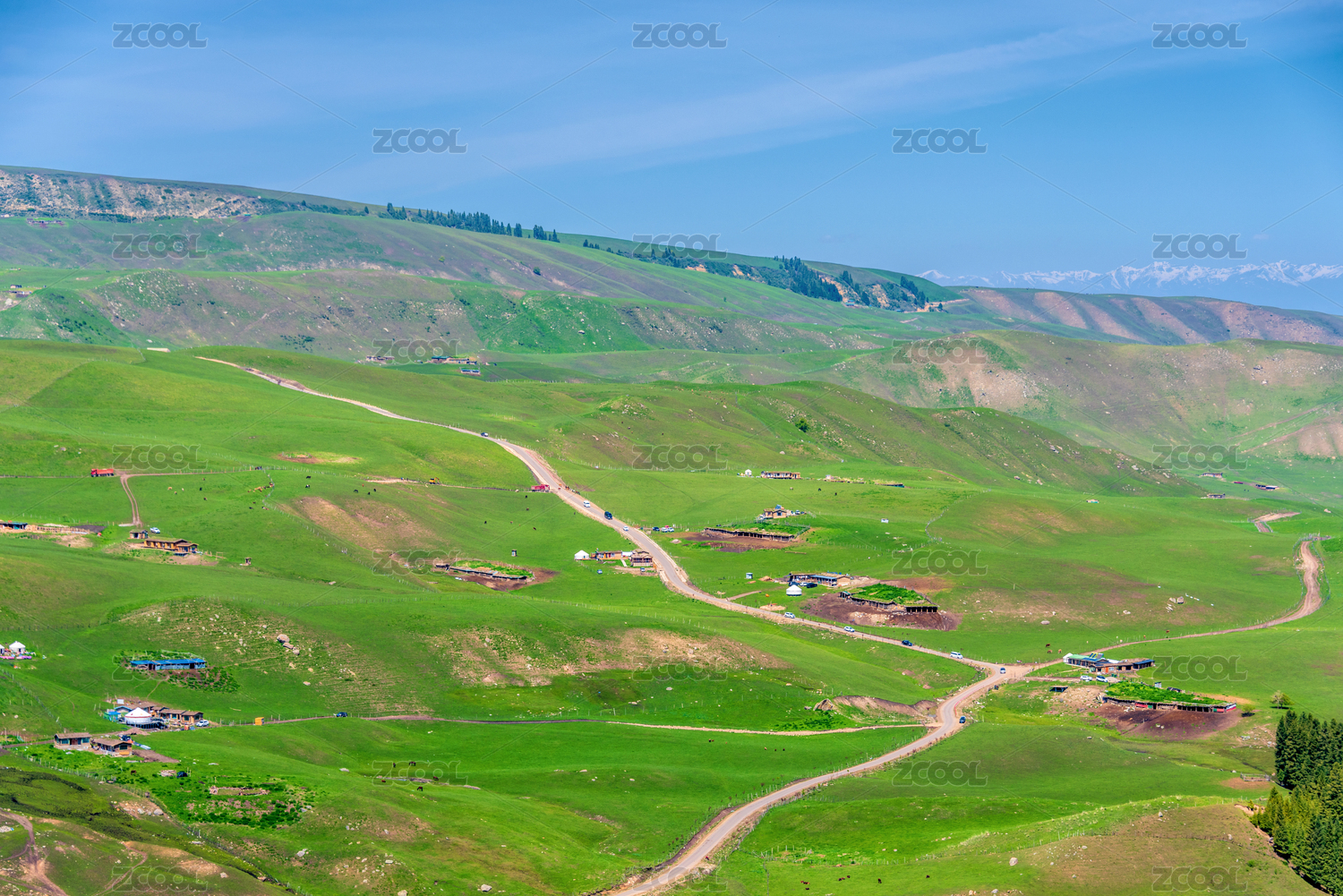 中国新疆琼库什台雪山下草原上的游牧聚落