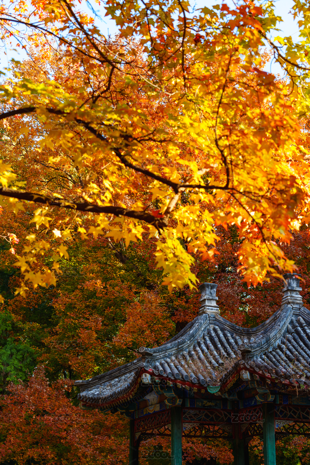 秋天红叶掩映中的中国传统建筑亭子