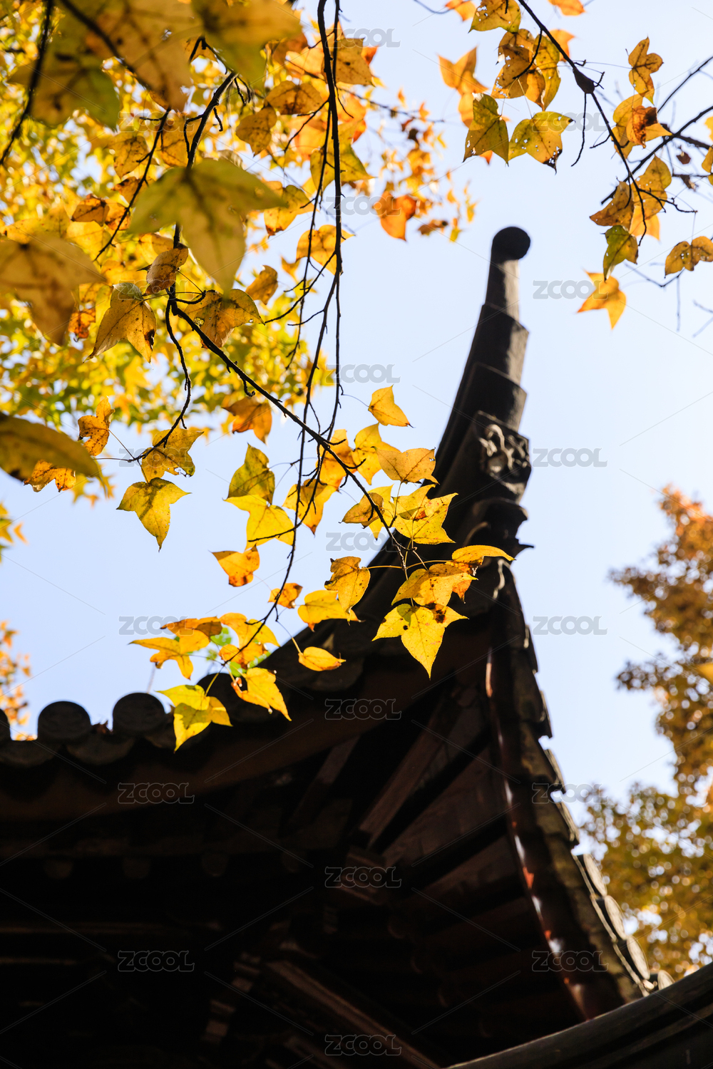 金黄银杏树与古建筑飞檐