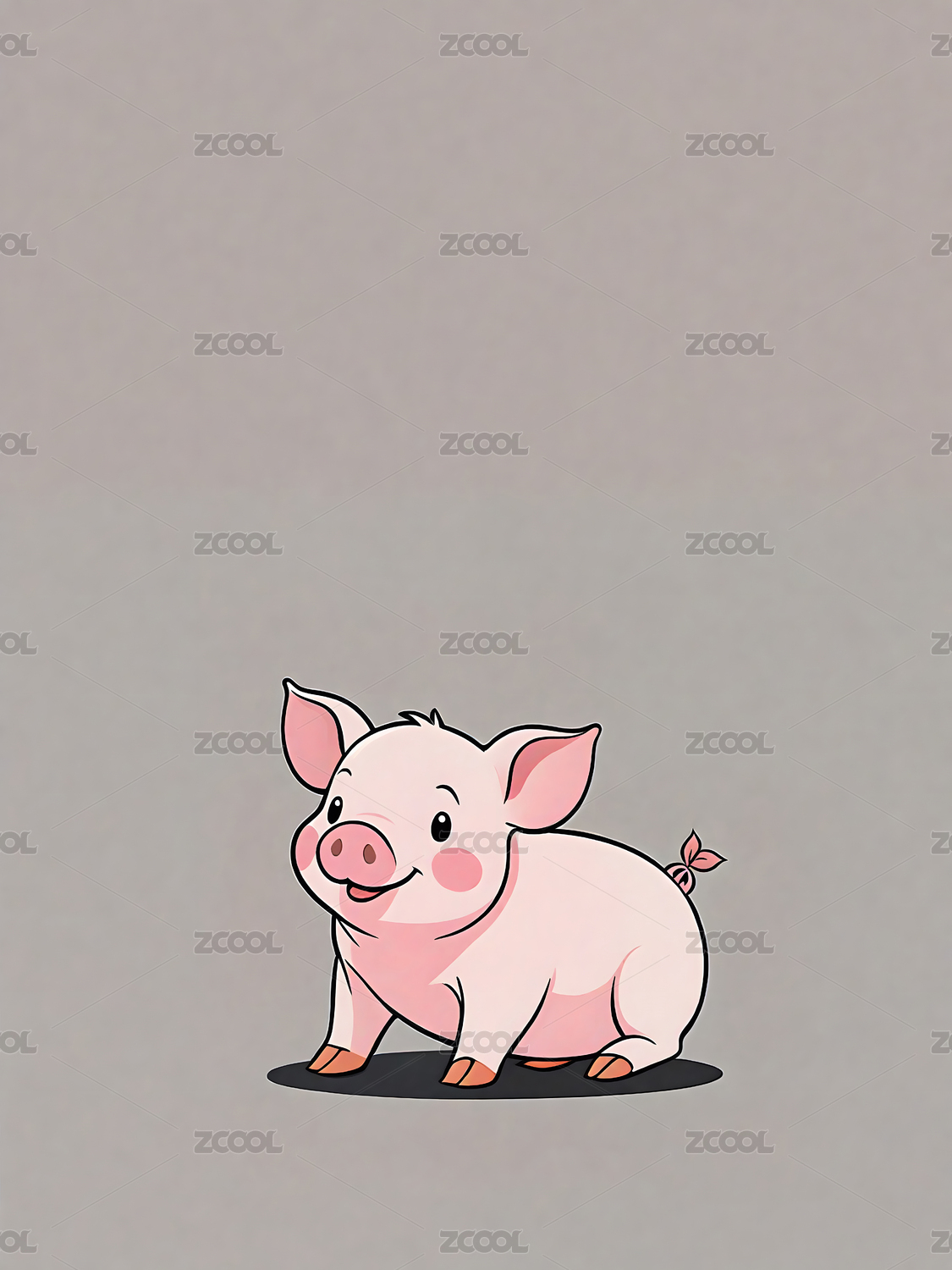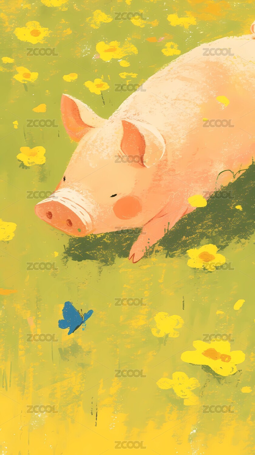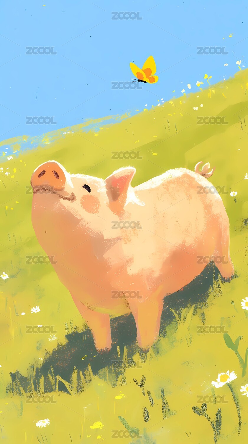 白天晴朗树丛草地的猪肥猪特写插画绘画手绘