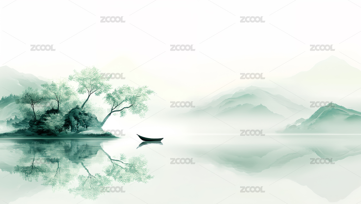 绿色水墨中国风山水风景画