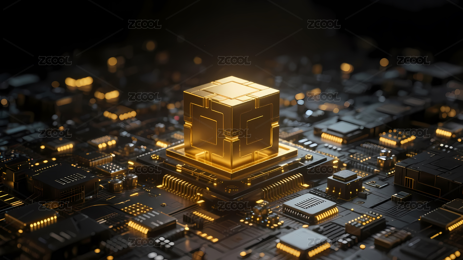 金色立方体与电路板的科技展示