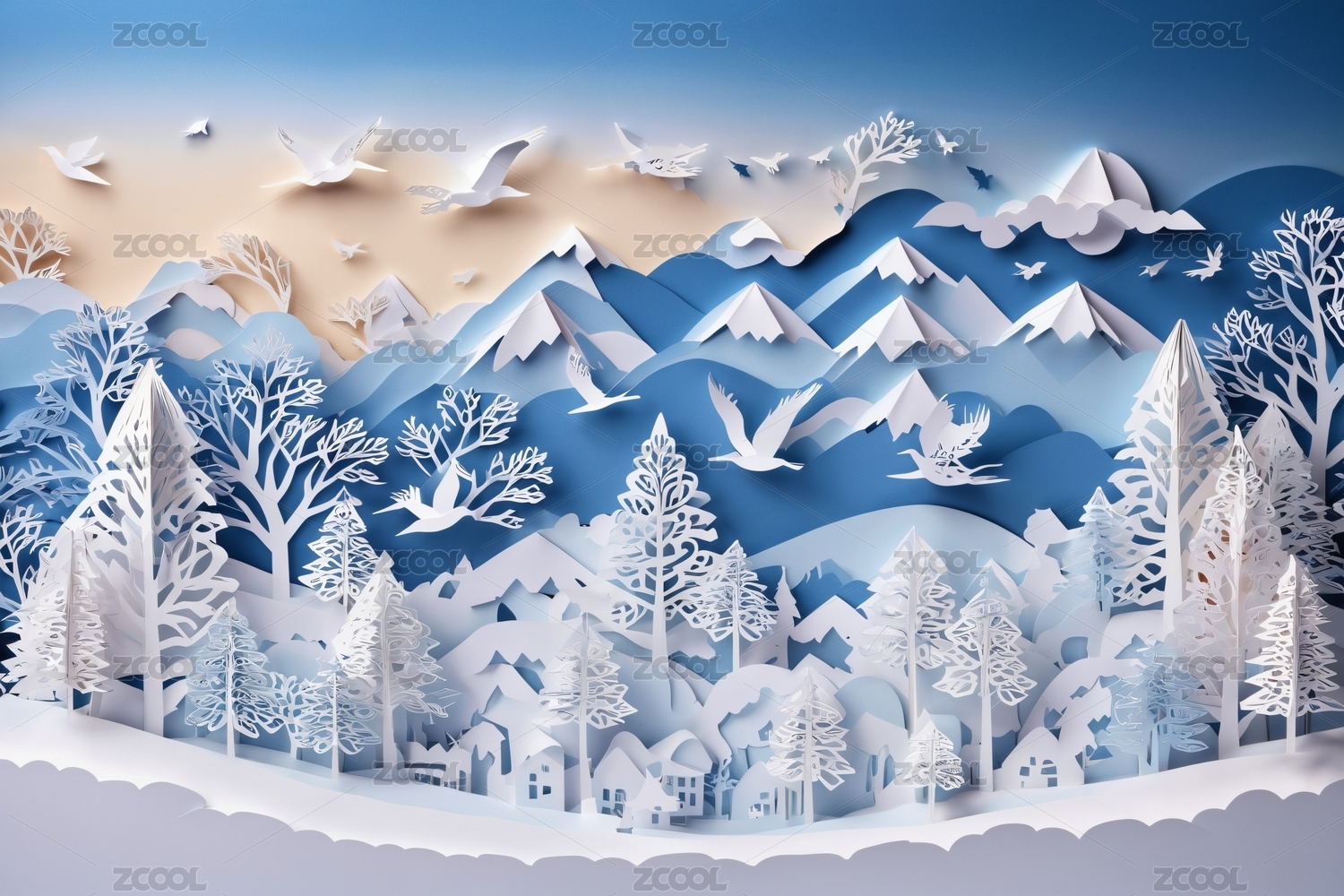 冬日雪山剪纸画