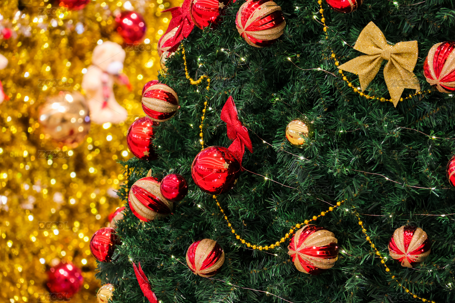 圣诞节里的挂满圣诞礼物的松树局部特写节日素