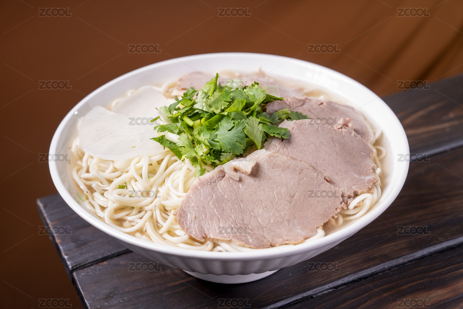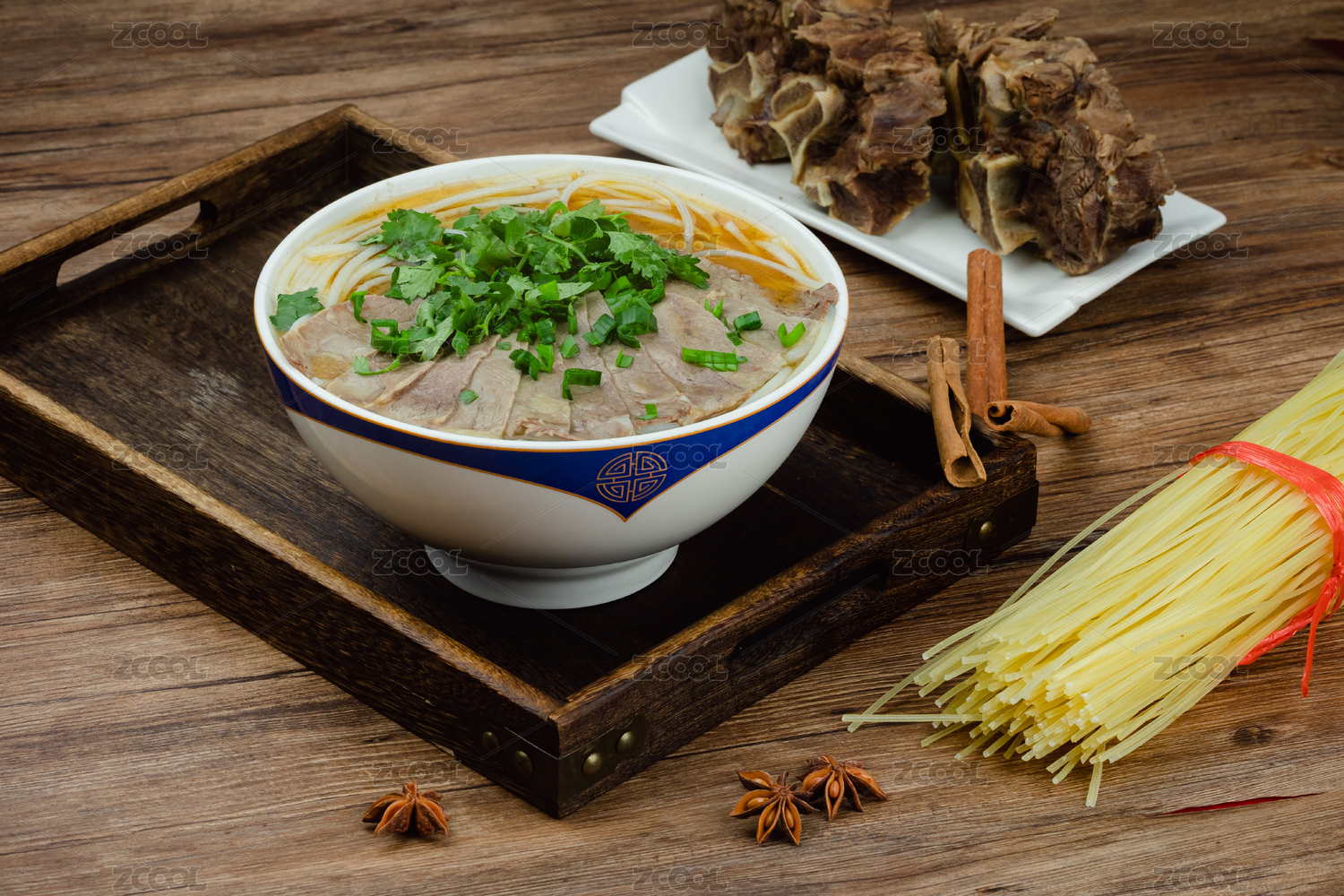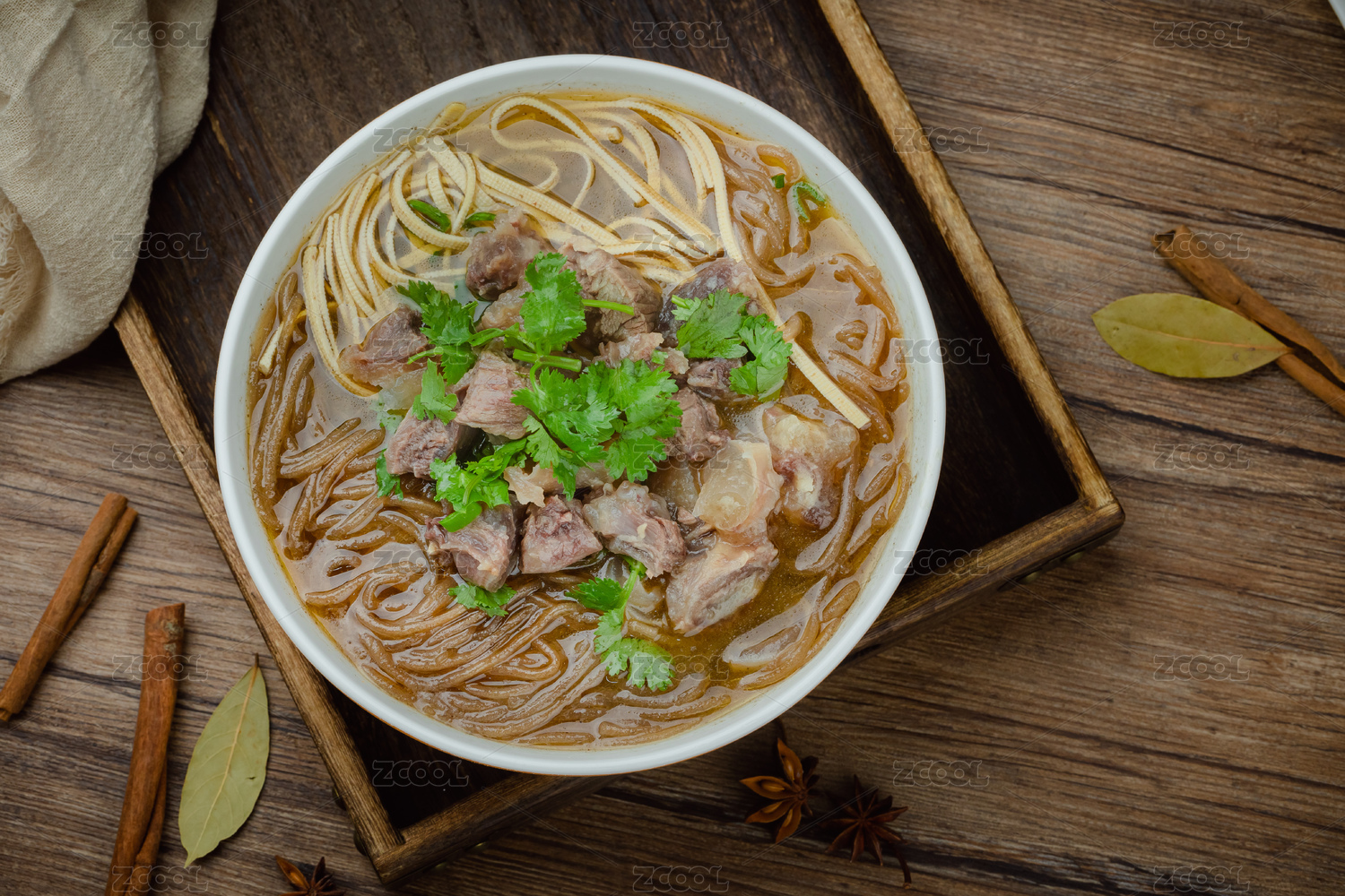 棕色桌面上放着一碗牛肉薄荷米线
