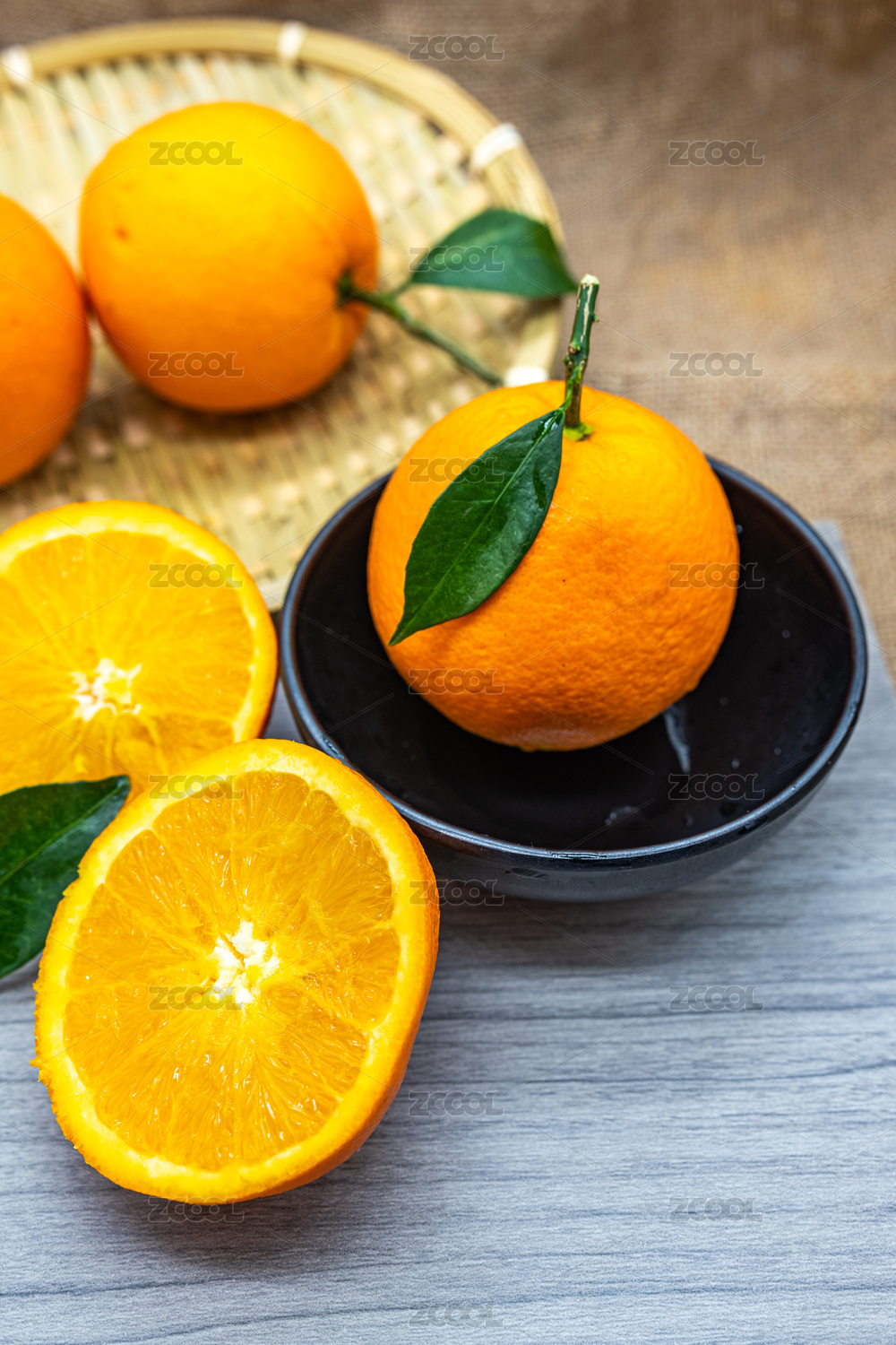 新鲜的水果橙子横截面高视角拍摄
