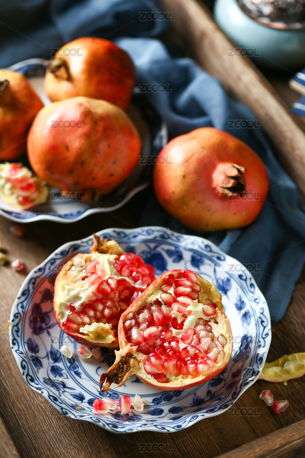 白底上放着一蓝新鲜会理石榴