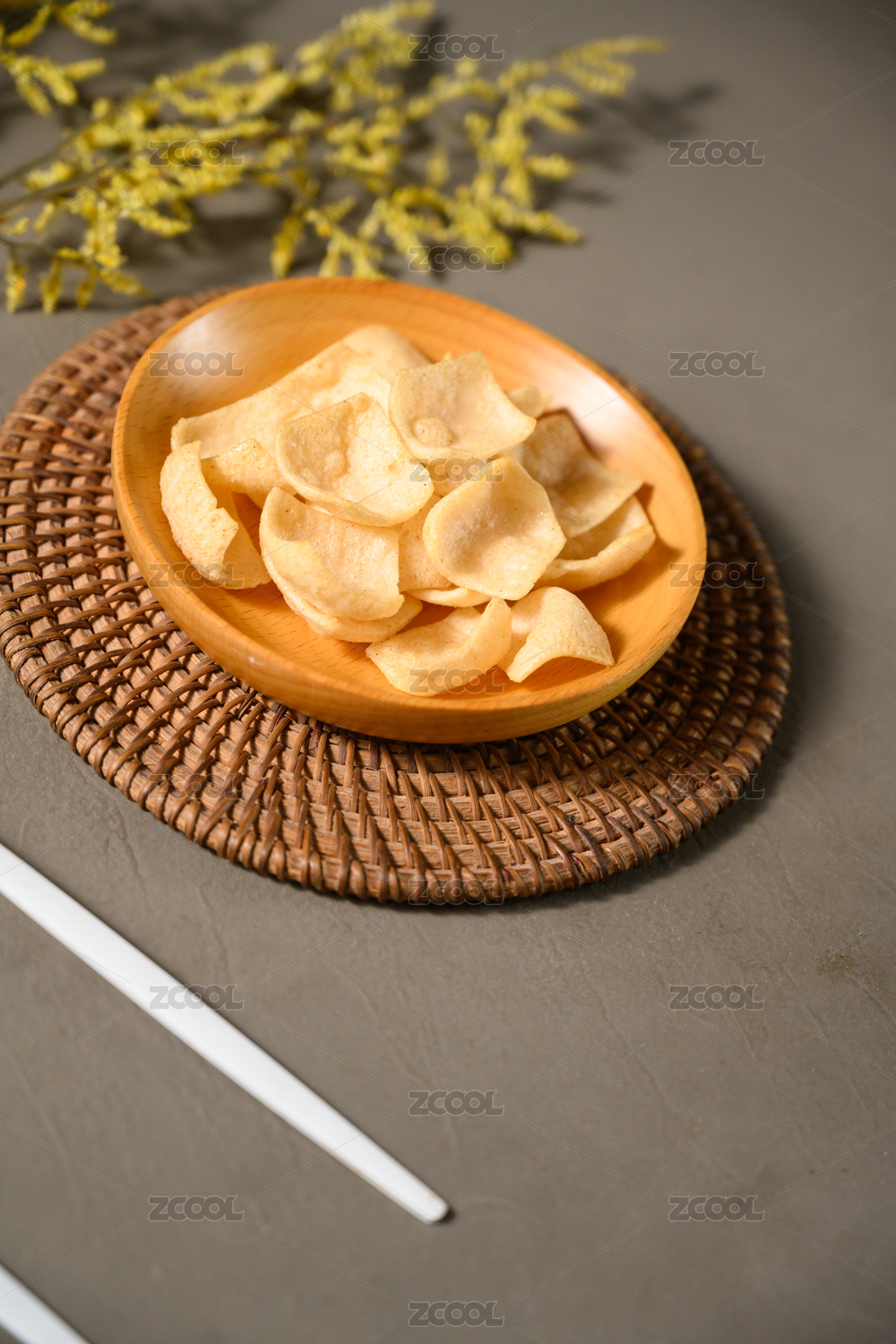 桌面上的盘子里的美味可口的虾片
