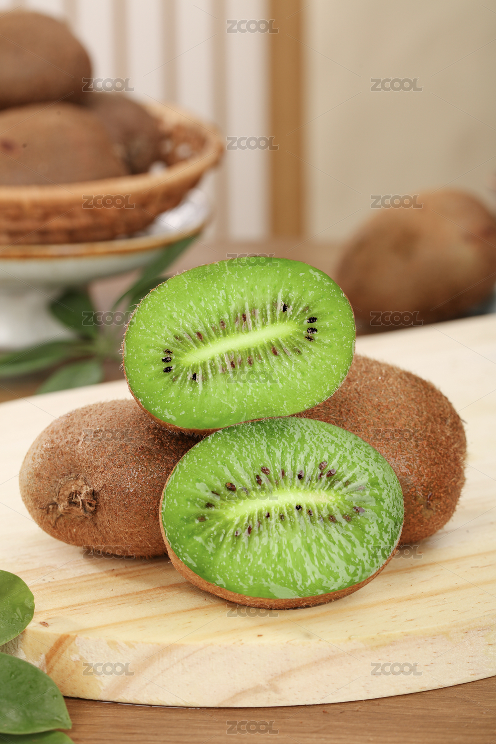 切开放在圆形木盘子上的新鲜绿心猕猴桃