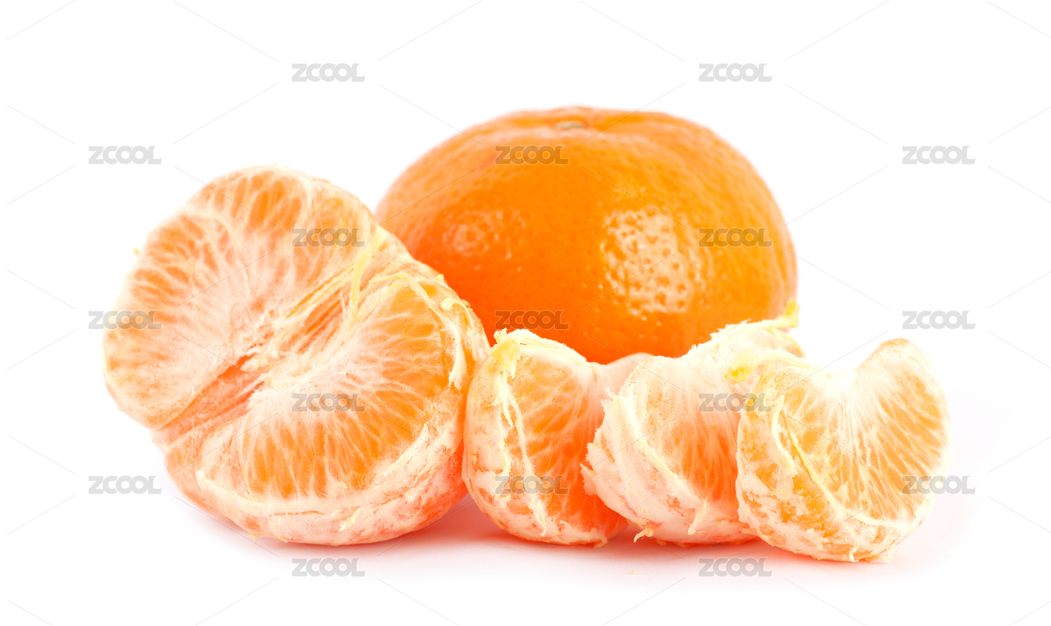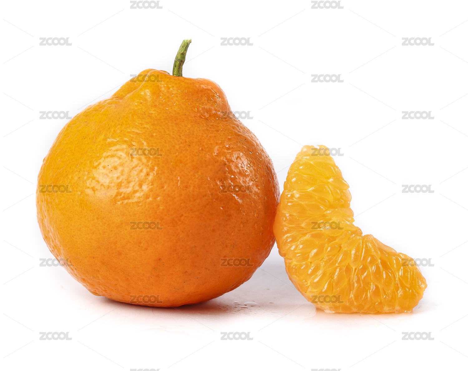 白底上放着一个完整的砂糖橘和蜜桔果肉