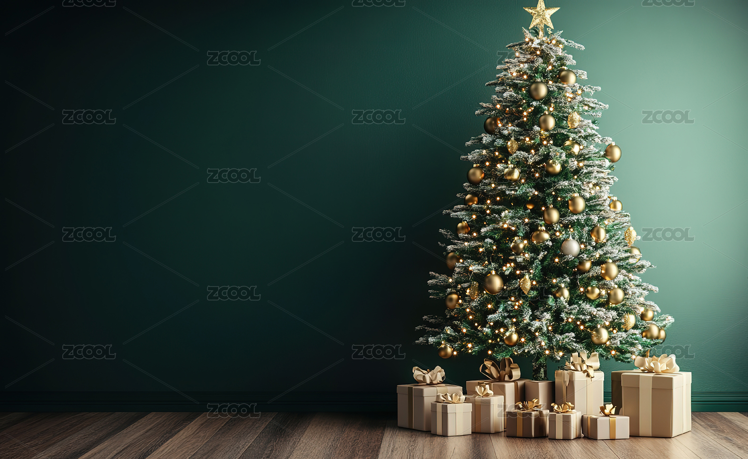 圣诞节,圣诞树,礼物,节日装饰,绿色背景,金色装饰,庆祝,喜庆,冬季,新年
