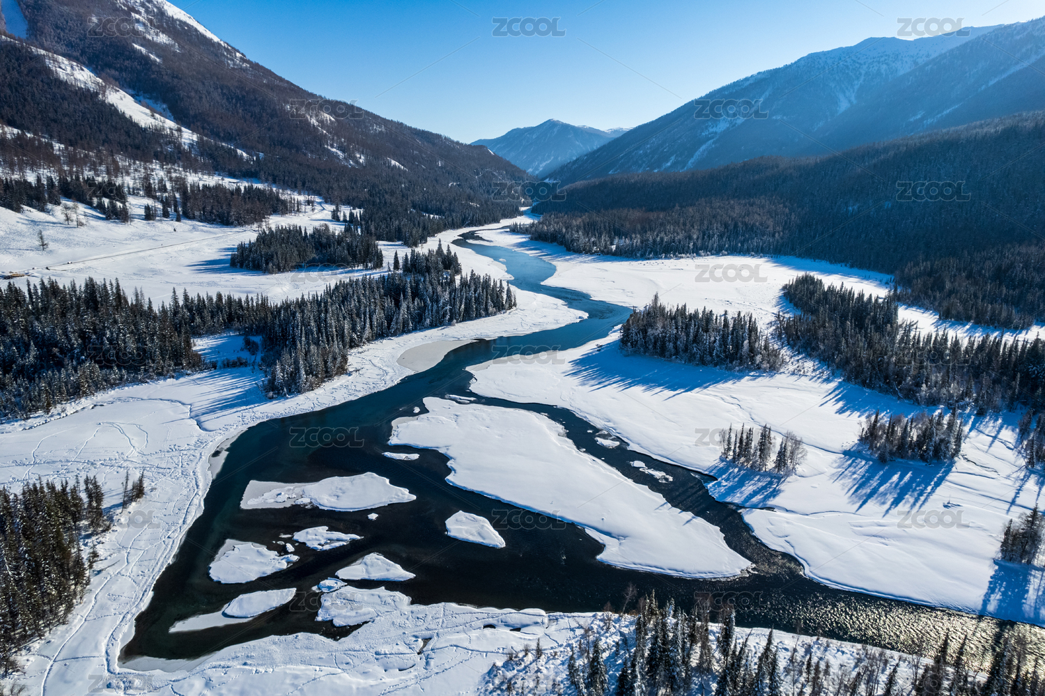 航拍中国新疆喀纳斯湖河水结冰森林雪山自然