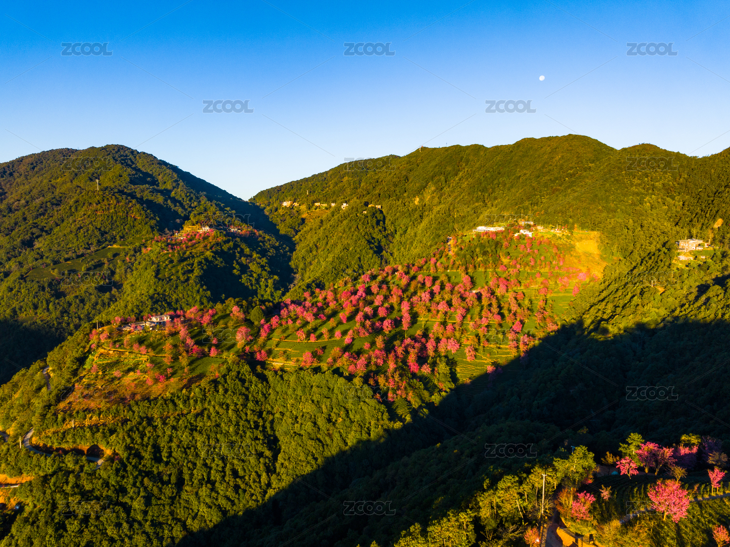 云南大理无量山樱花谷冬樱花和茶园清晨航拍