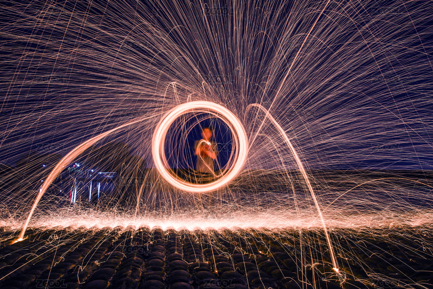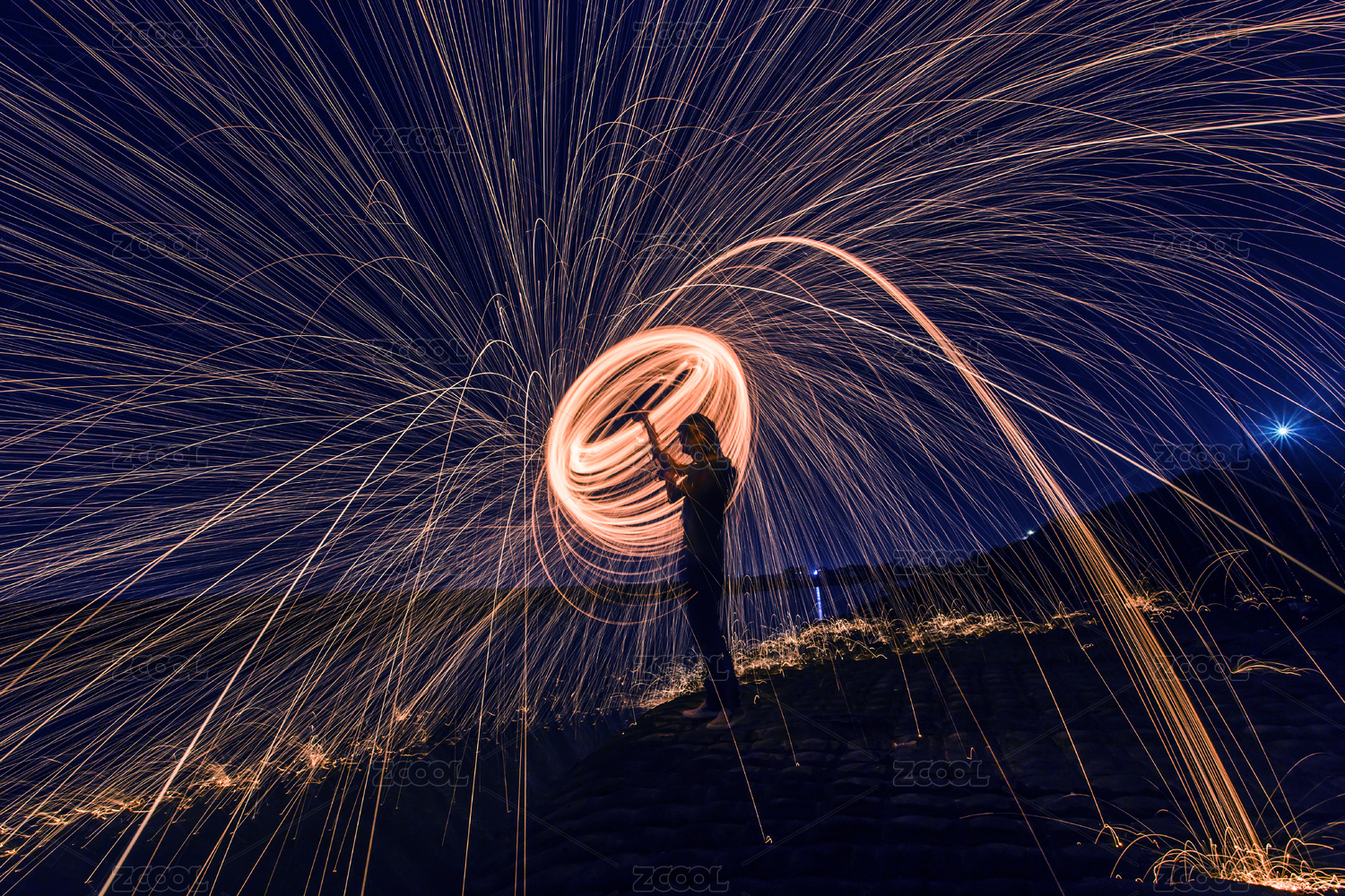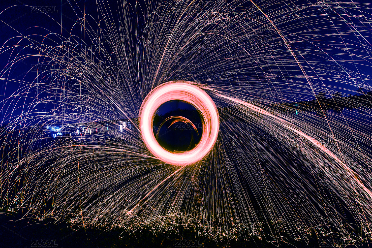 漆黑夜晚钢丝棉燃烧绘制的光绘效果