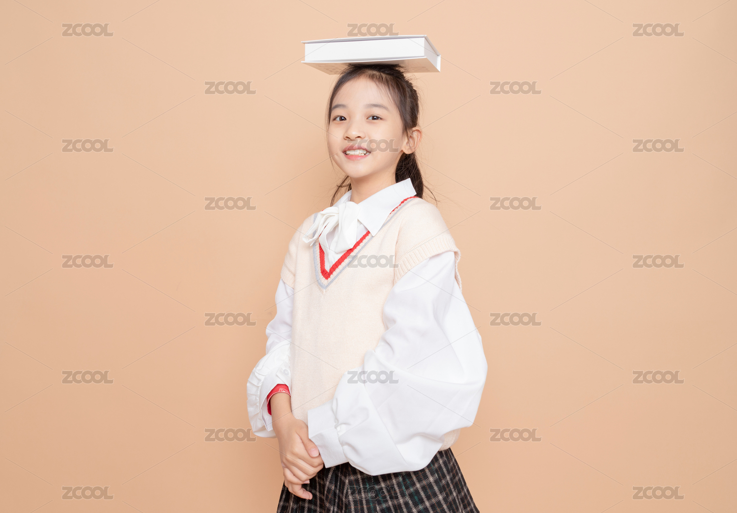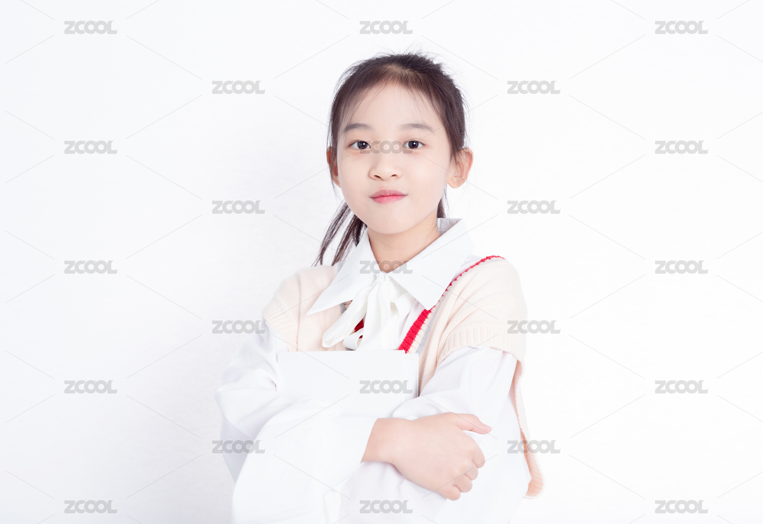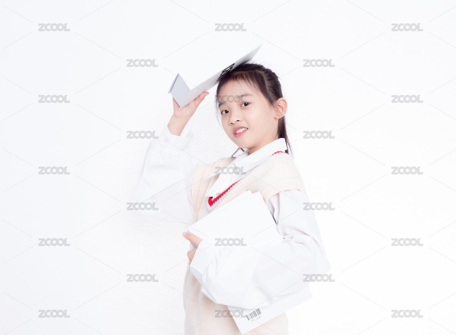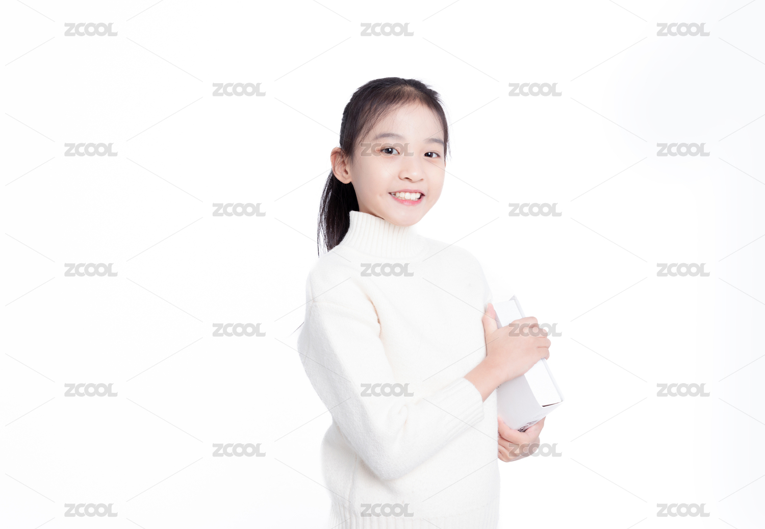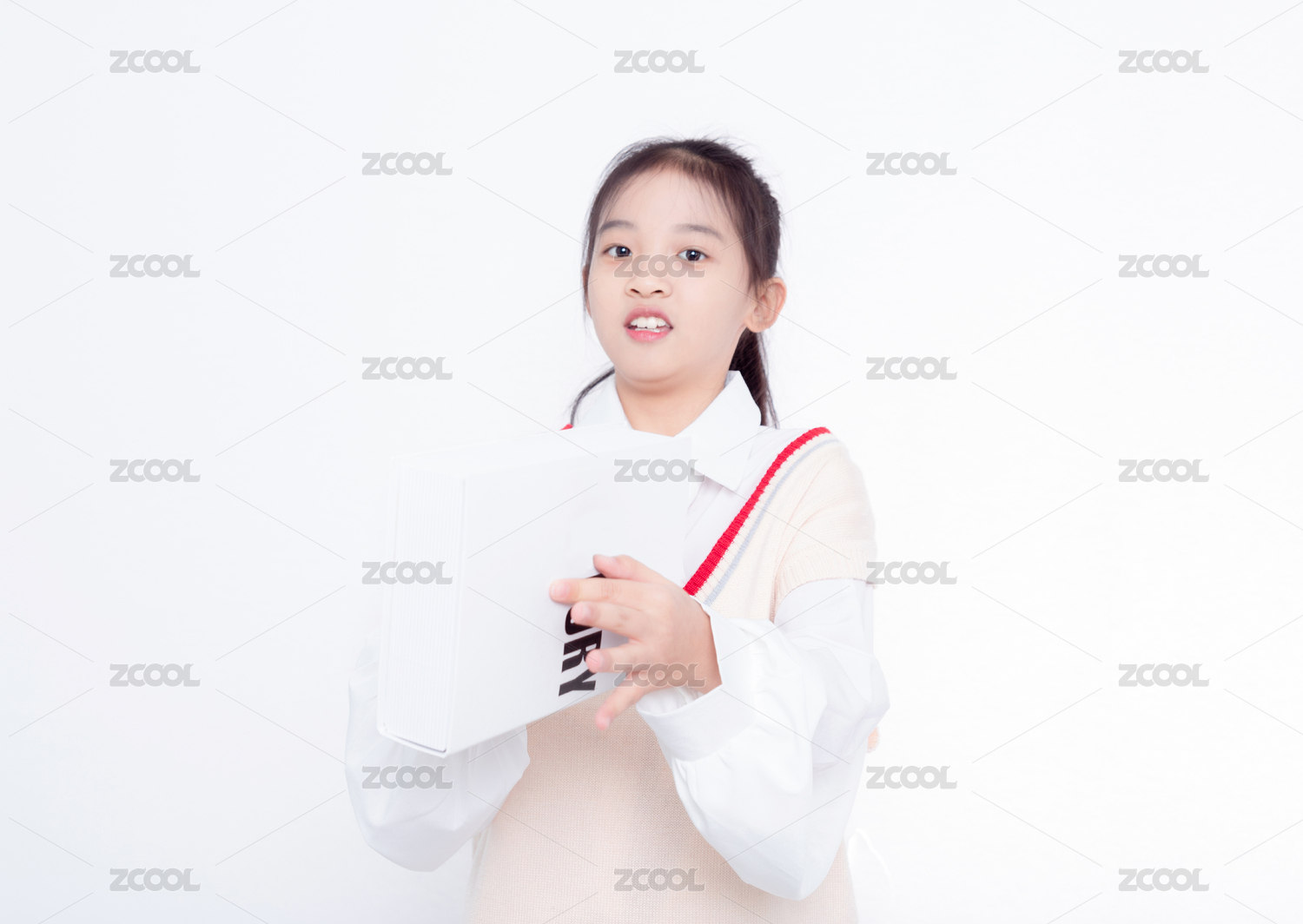 东方人,中国,黄种人,女孩,小学生,白色背景,手势,笑,手,书