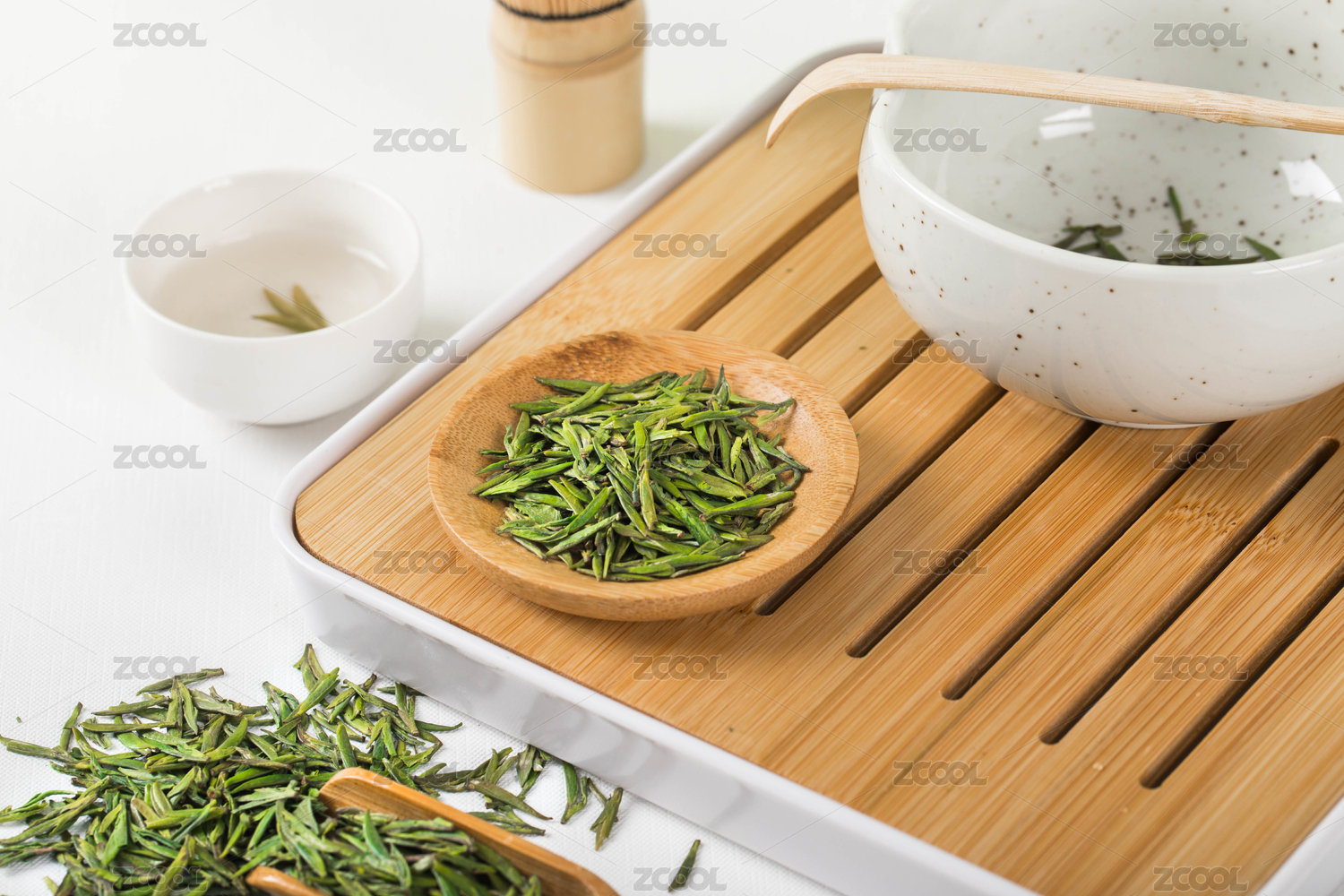 白色背景上的安吉白茶茶叶特写