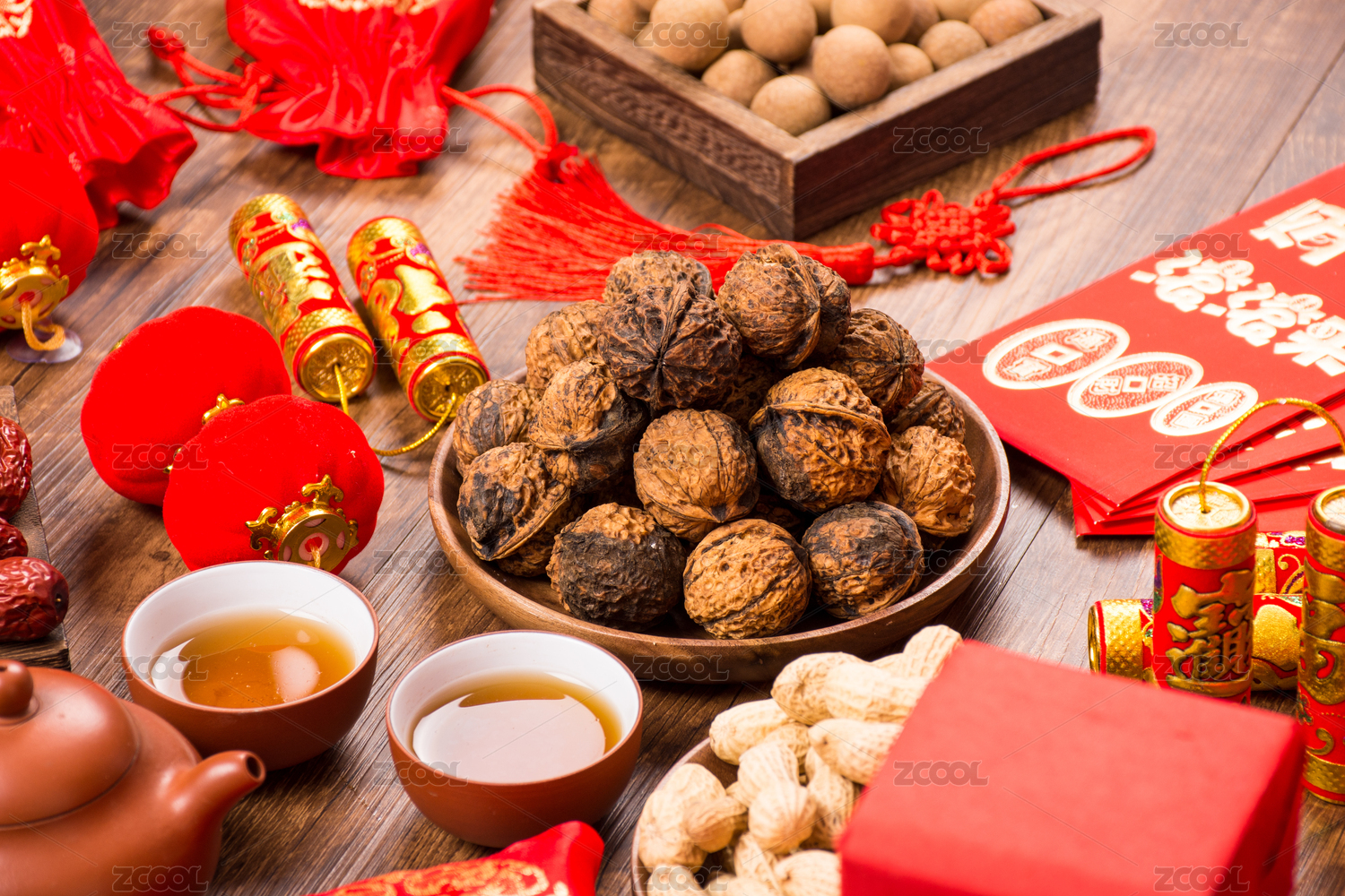 茶礼,茶具,年货,核桃,干货,零食,灯笼,炮仗,红色,红包
