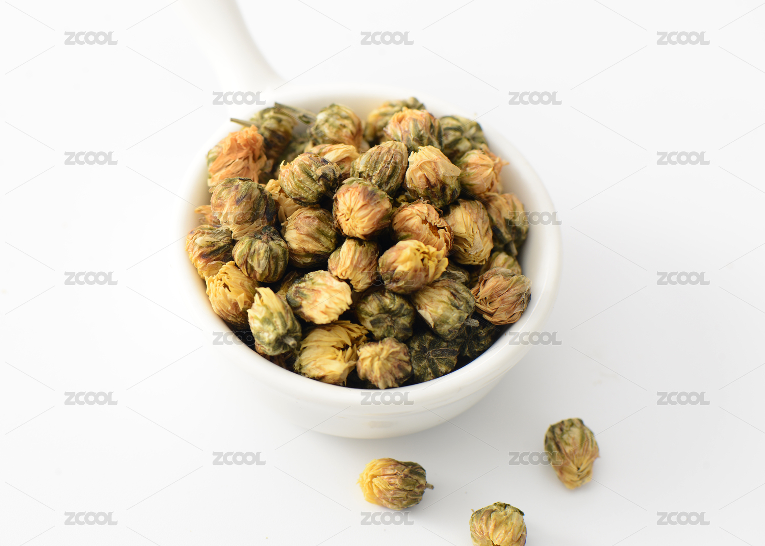 用白瓷碟装的中药材铁皮石斛放在白色背景上
