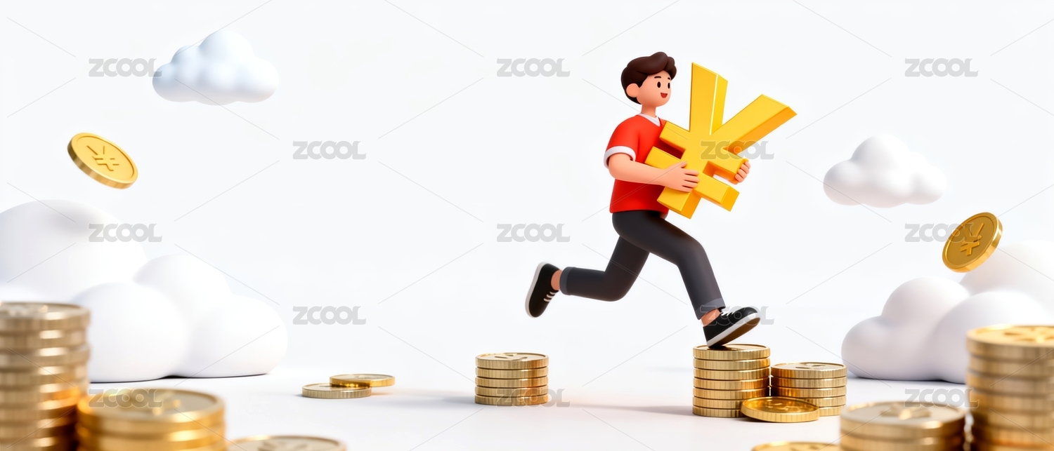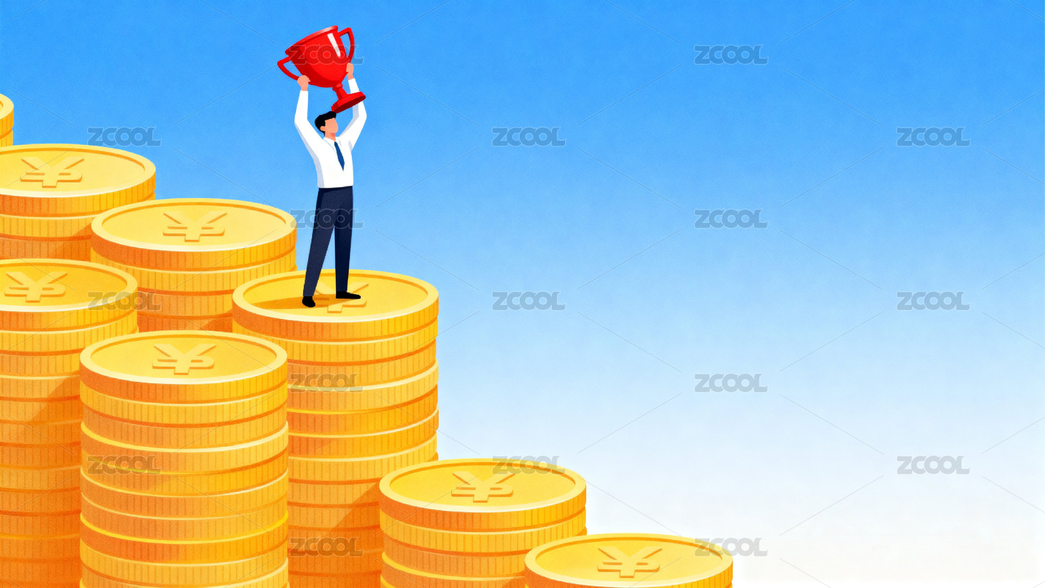 人物高举奖杯立于金币堆