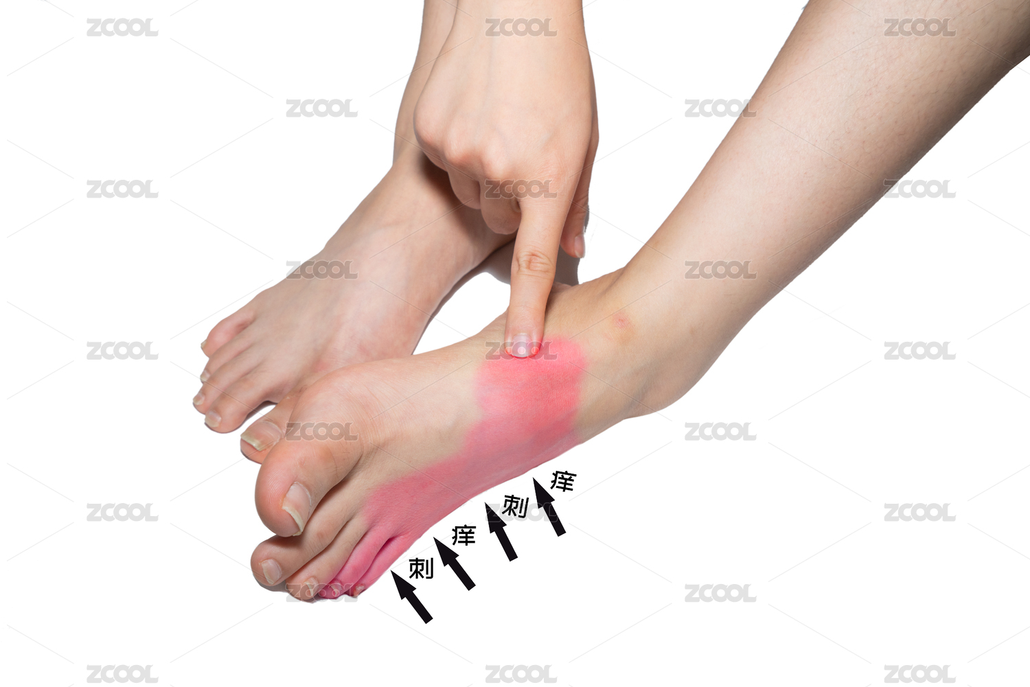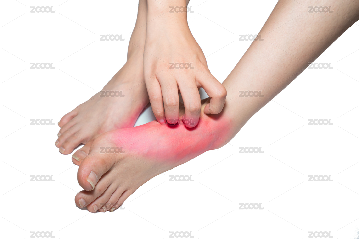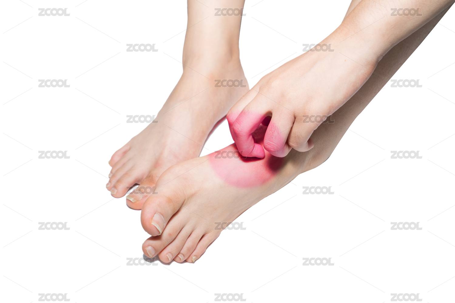 一个人脚部红肿痒痒正在挠痒痒疑似得了脚气香港脚灰指甲棚拍白色背景