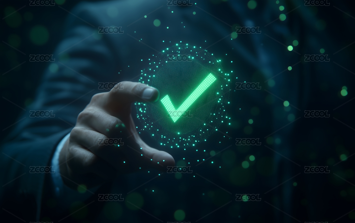 黑色背景下手指着绿色对勾符号
